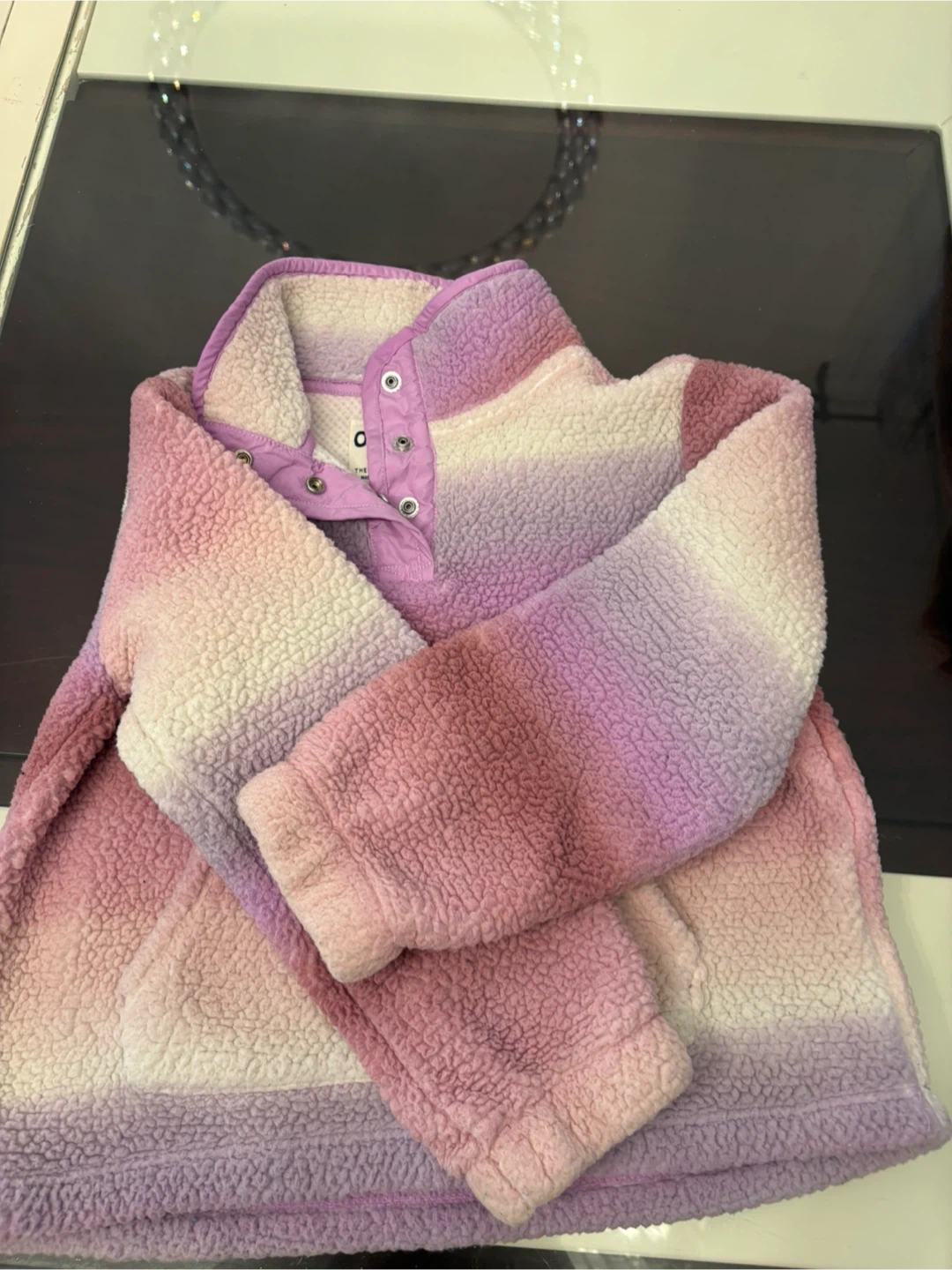 Cozy up in this Old Navy sherpa pullover! It features a lovely ombre design in shades of pink, purple, and white. It's a size medium and perfect for staying warm on chilly days