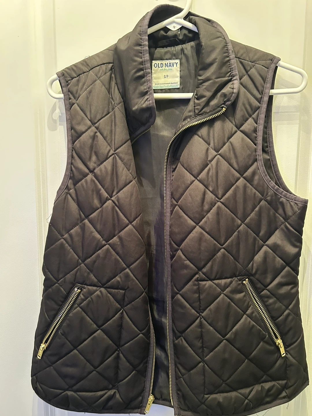 Selling a gently used Old Navy quilted vest in size small. It's a stylish and comfortable piece, perfect for layering! The vest features a quilted design and is made of 100% polyester.