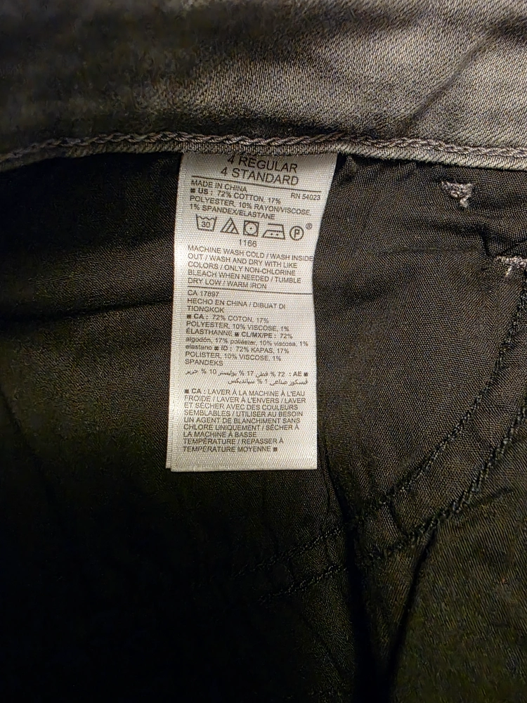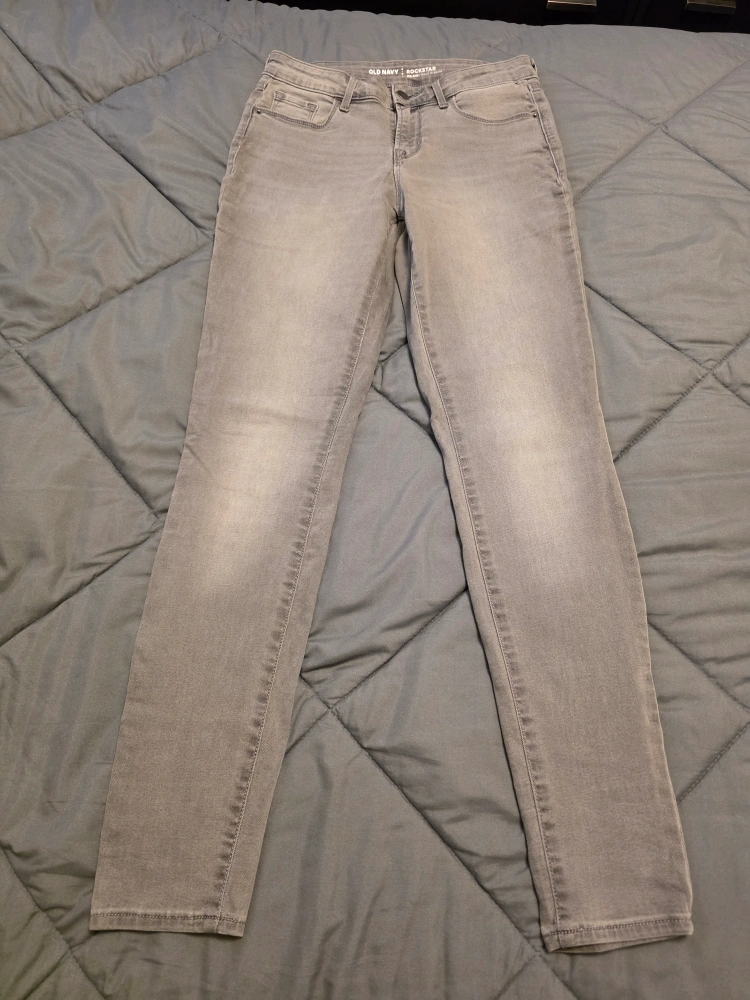 Selling a pair of Old Navy Rockstar jeans in size 4 regular. They are a stylish grey colour and in great condition. The material is a comfortable blend of cotton, polyester, rayon, and spandex.