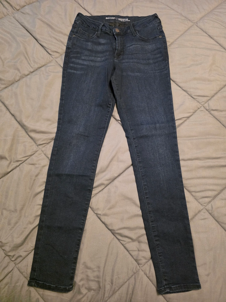 Selling a pair of Old Navy Rockstar jeans in size 4 regular. They're in great shape and ready for a new home! The material is 77% cotton, 21% polyester, and 2% spandex/elastane, making them comfy and stretchy