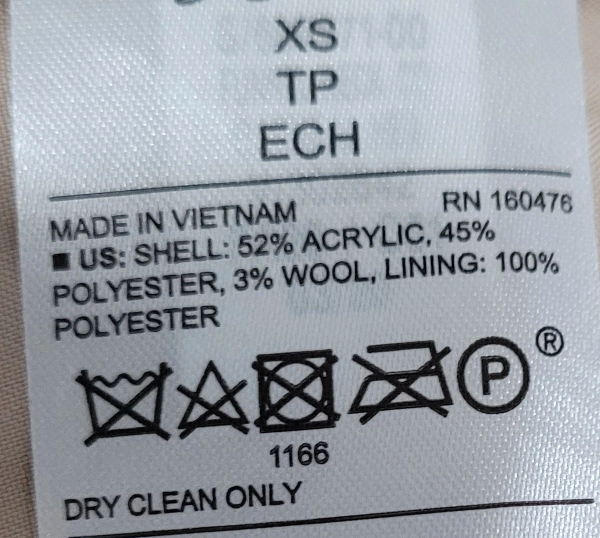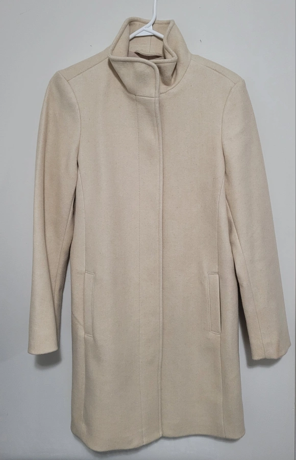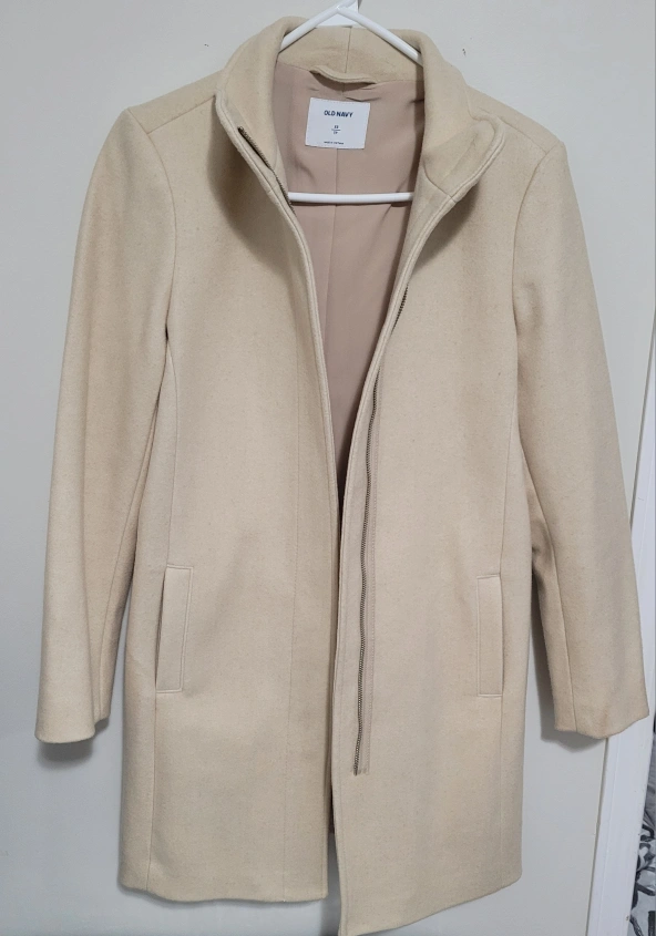 Selling an Old Navy coat in size XS! It's a lovely beige colour and made from 52% acrylic, 45% polyester, and 3% wool. The lining is 100% polyester. **worn TWO TIMES only