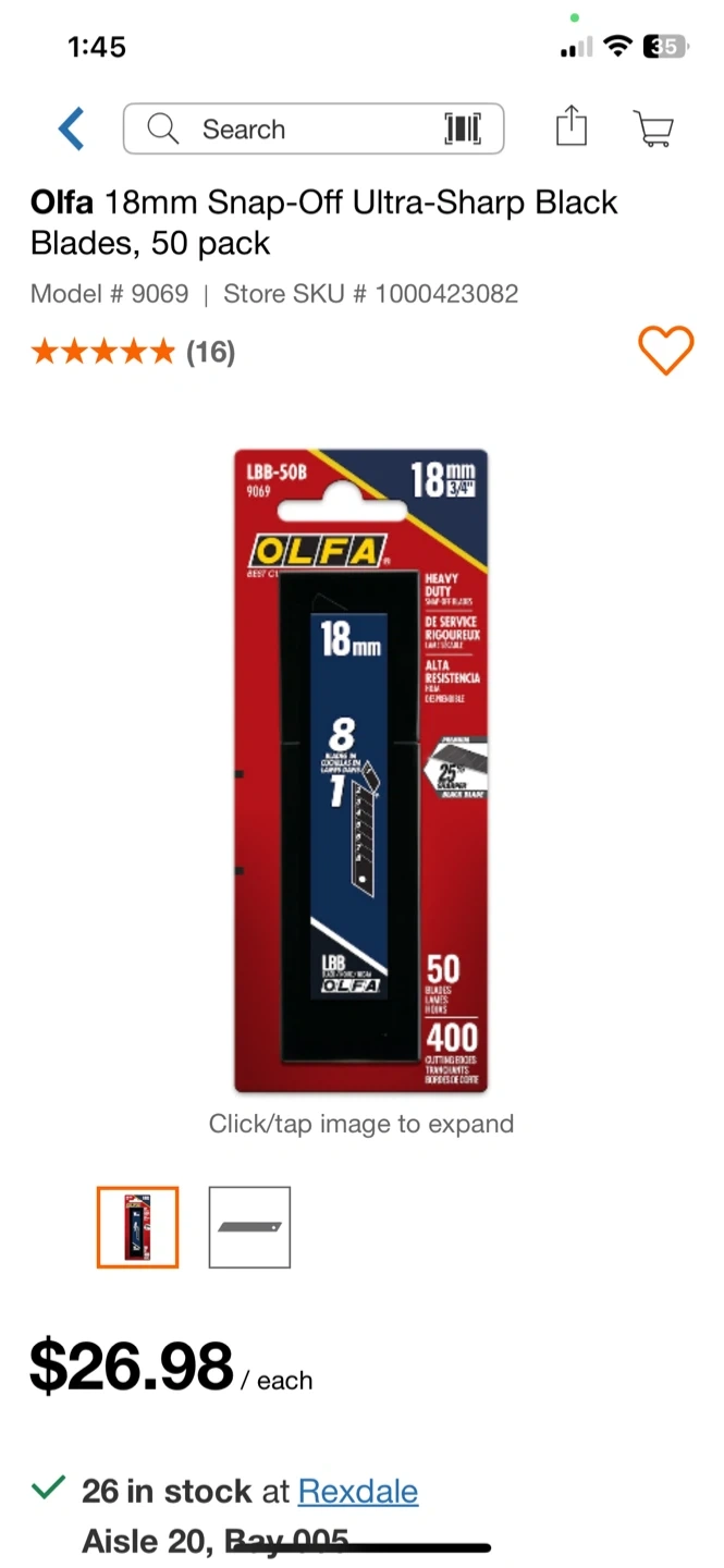 78Selling a pack of Olfa 18mm Snap-Off Ultra-Sharp Black Blades. This is a 50 pack of blades, model #9069. They are heavy-duty and provide 400 cutting edges