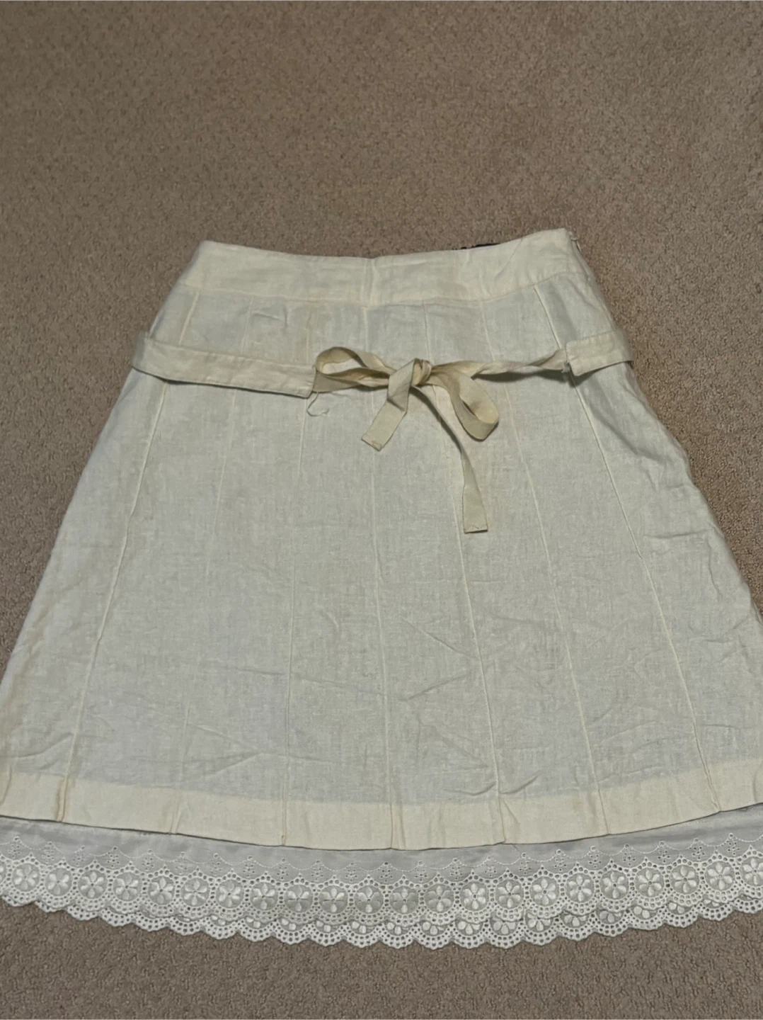 41Selling a cute Olive de Olive skirt! It's a cream colour and has a lovely lace trim. The material is a blend of 55% rayon and 45% linen for the outer layer, and 100% polyester for the lining. Perfect for a breezy summer day!