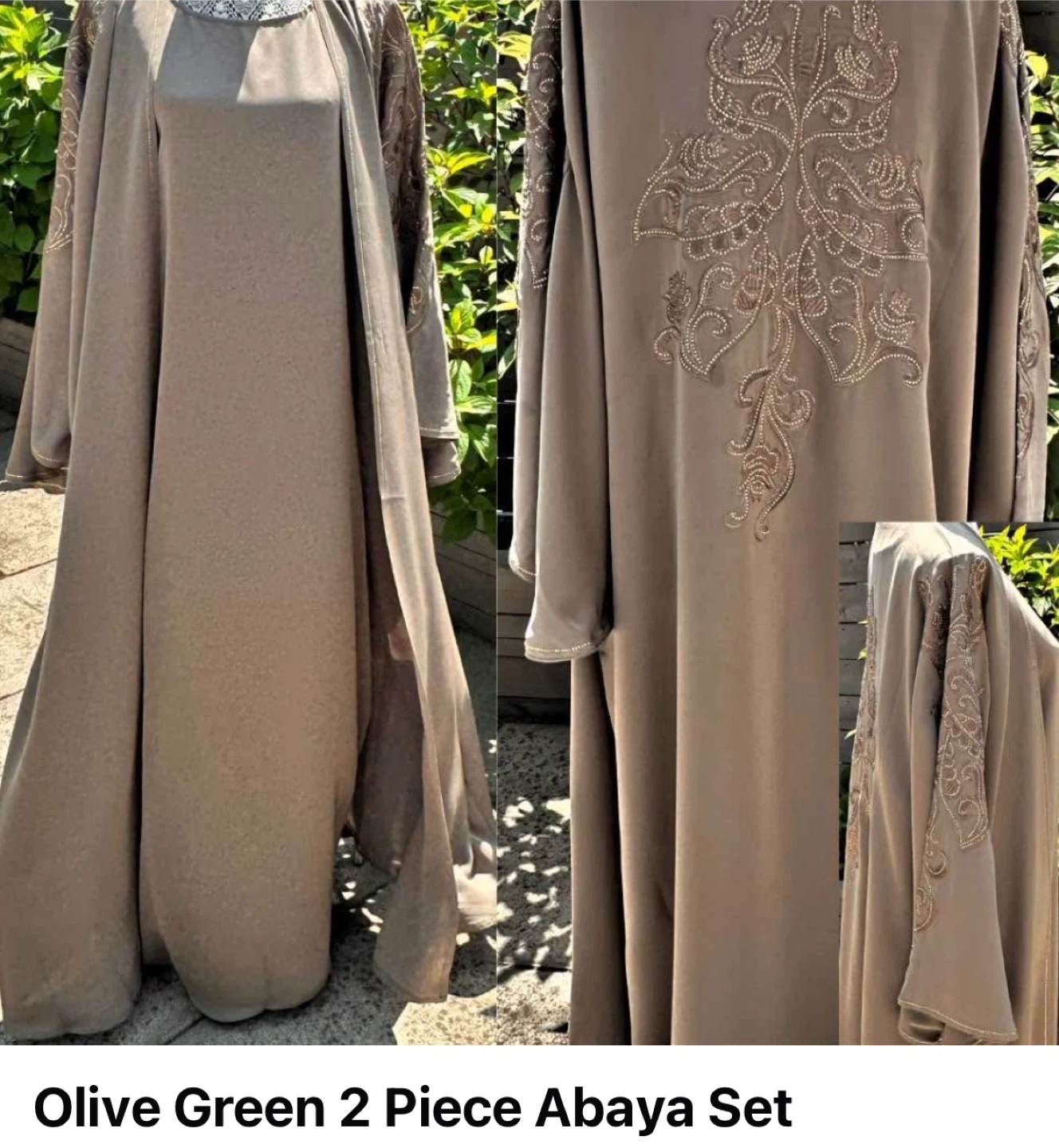 292This is a lovely olive green 2 piece abaya set. It features beautiful detailing on the sleeves and back. Perfect for special occasions or everyday wear! Custom made - 54 inches length - inner slip chest size 22 inches $70 Fastest pick up - Brand New - never worn.