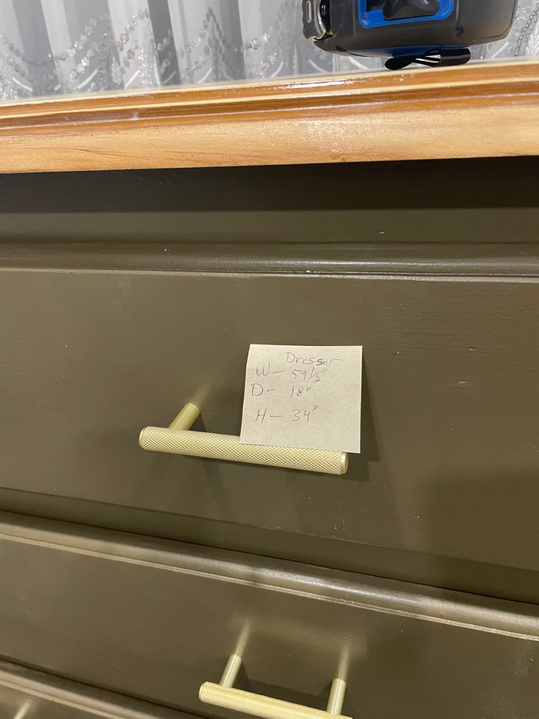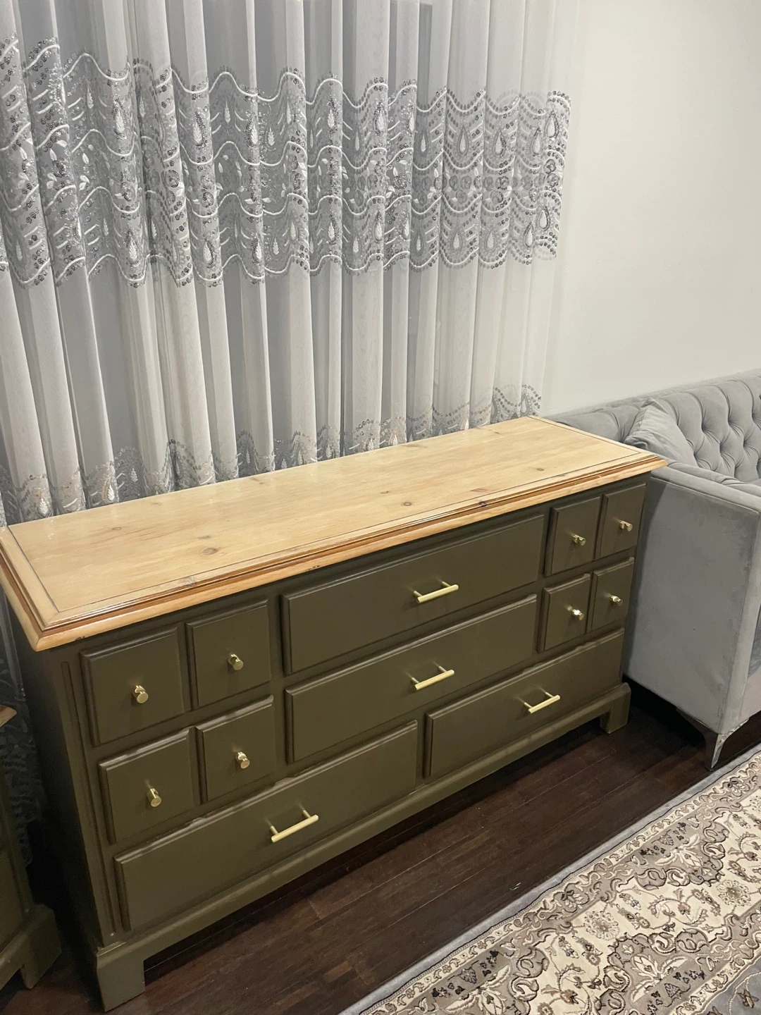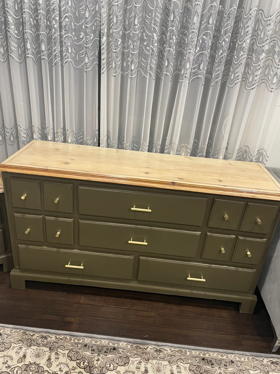 10Selling a dresser in good condition. It's an olive green colour with a light wood top and gold handles. Dimensions: - Width: 59.5 inches - Depth: 18 inches - Height: 34 inches