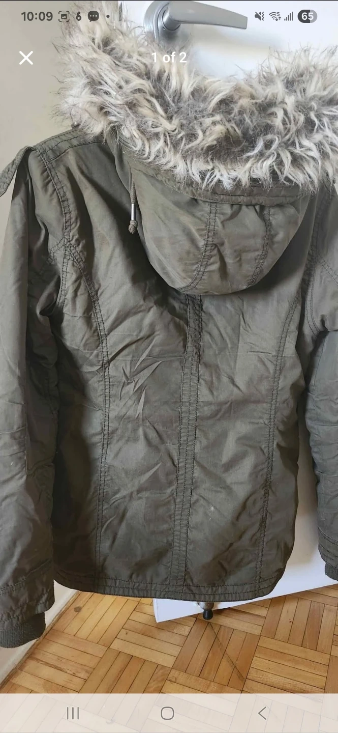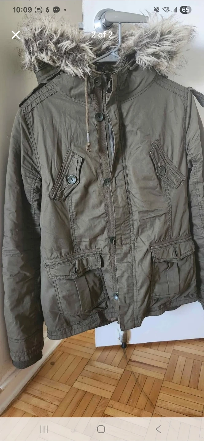 5Selling a gently used olive green jacket with a fur-trimmed hood. It's in good condition and perfect for cooler weather. Has a few pockets for storage!