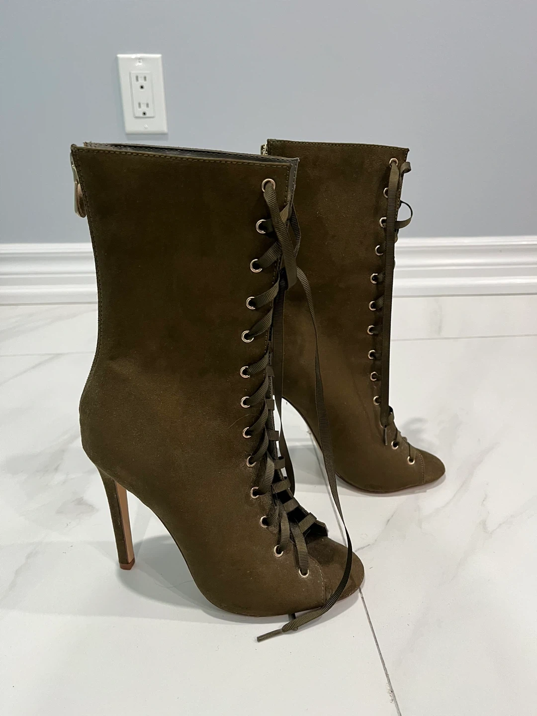 10These olive green heeled booties are in great condition! They feature a lace-up front and a zipper in the back