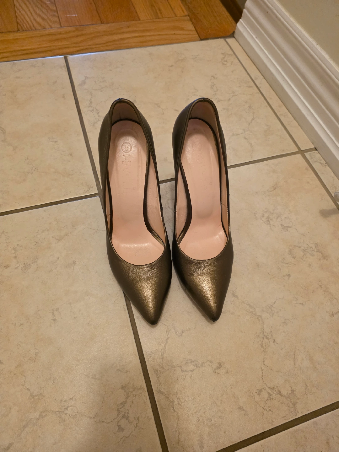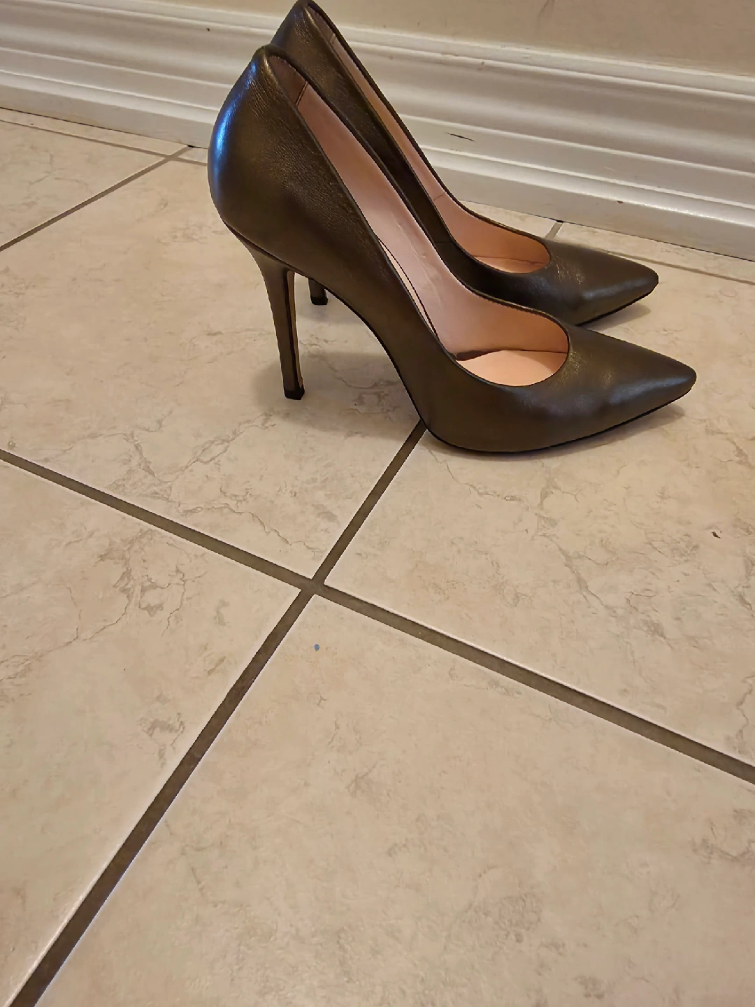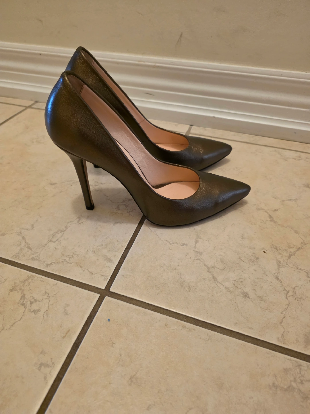 60These olive green leather heels are in good condition and ready for a new home! They are a European size 37, which is approximately a US size 6.5. They have a classic pointed-toe design and a sleek stiletto heel. Perfect for dressing up any outfit!