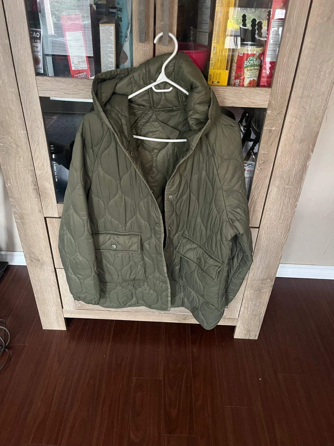 Selling a cozy olive green quilted jacket with a hood. It's in great condition and perfect for layering during the cooler months. The quilted design adds a stylish touch, and the hood provides extra warmth and protection from the elements. A practical and fashionable addition to any wardrobe!