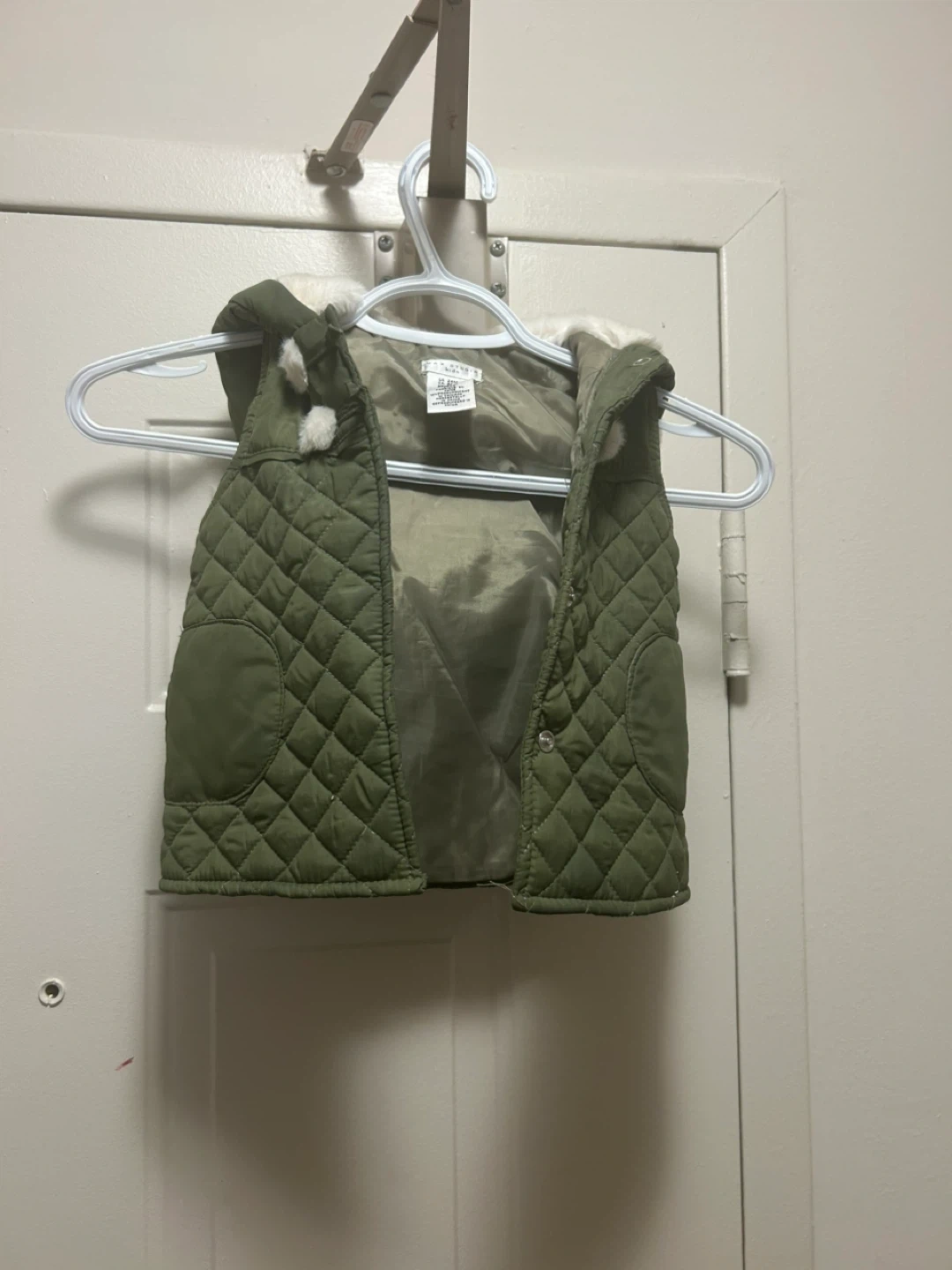 A cute olive green quilted vest in size 5T. It's in great shape and ready for a new home! The vest features a soft lining, perfect for keeping your little one cozy during cooler days