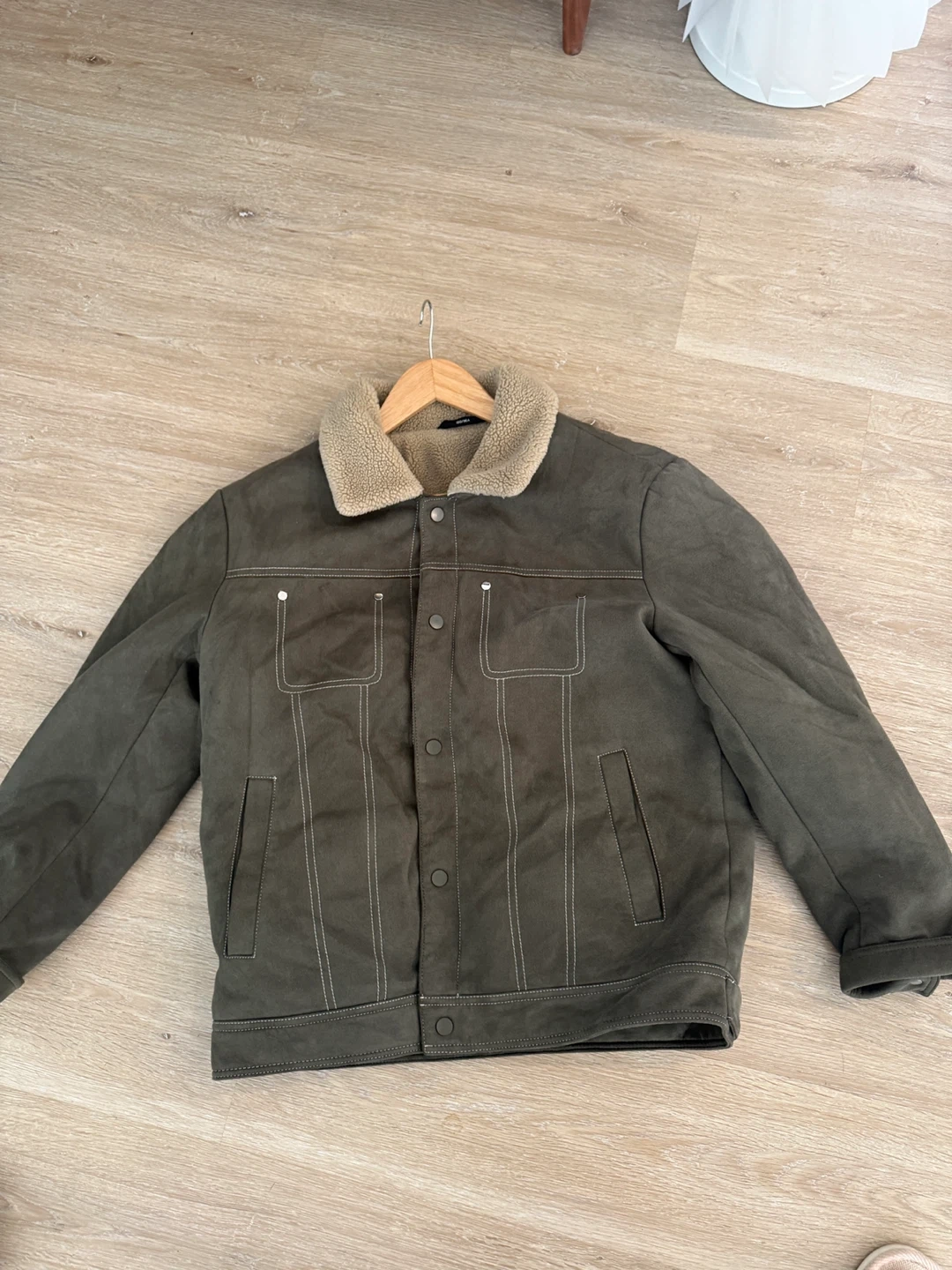 Cozy up in this Zara Man jacket! It's an olive green colour with a soft sherpa lining. Perfect for those chilly Canadian days. It has a classic design with button closure and functional pockets. A stylish and warm addition to any wardrobe!