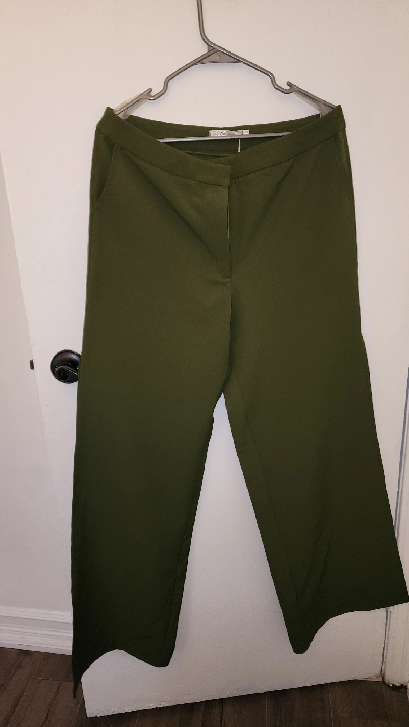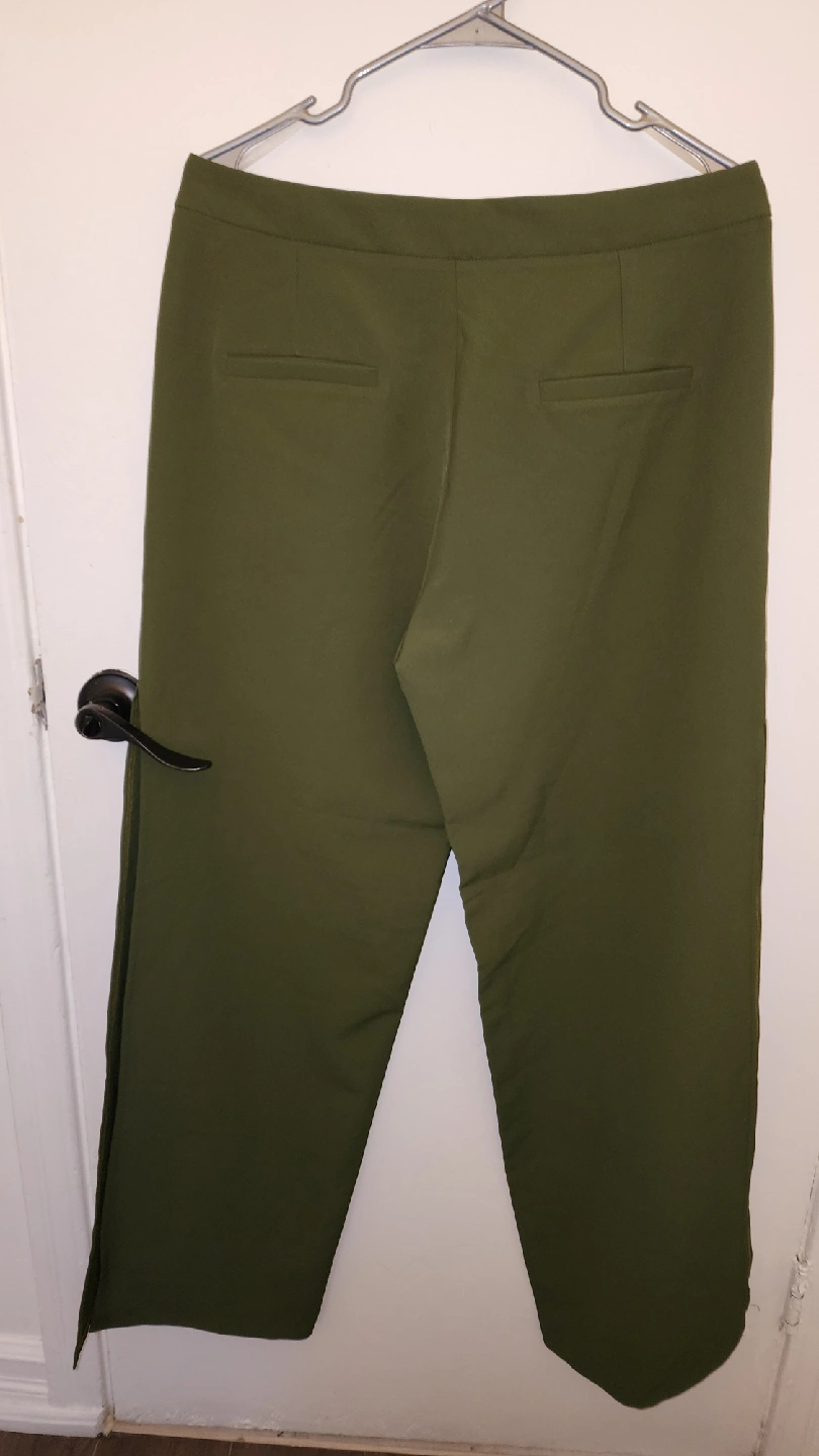 These are a pair of Oxygene pants in a lovely olive green colour. They feature a stylish slit at the bottom of each leg. The size is UK 16 EUR 42
