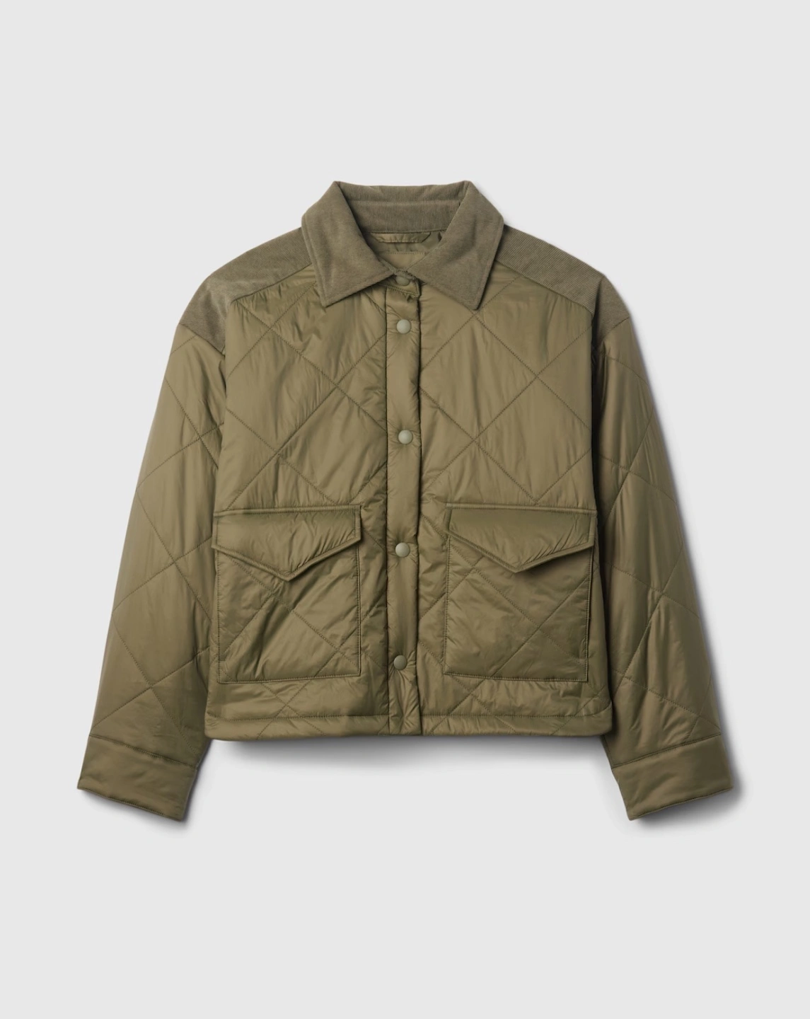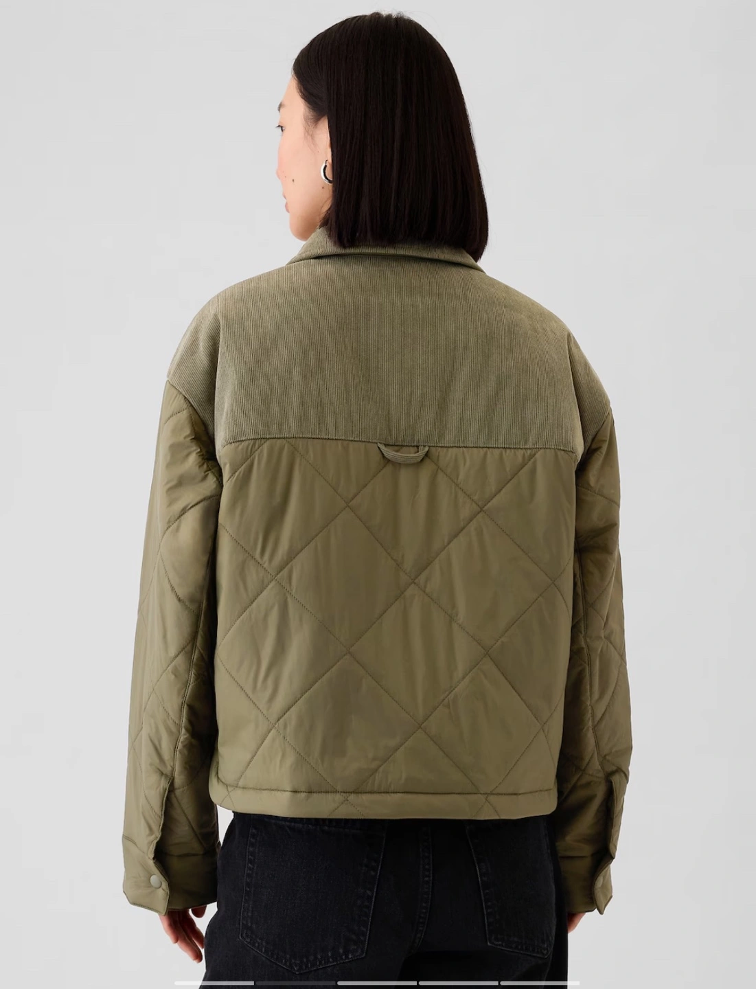 79BRAND NEW, never used, Still with the labels…Women's olive green quilted jacket. Diamond quilted pattern. Corduroy collar and shoulder detail. Snap button closure. Front pockets. Relaxed fit.