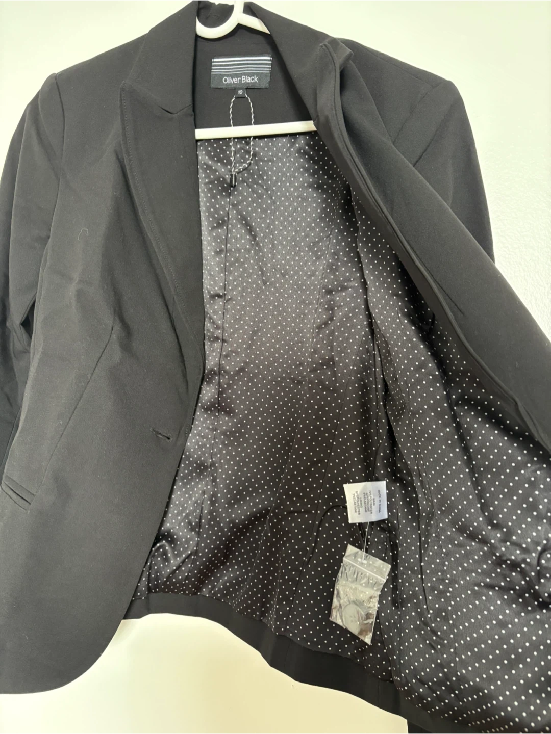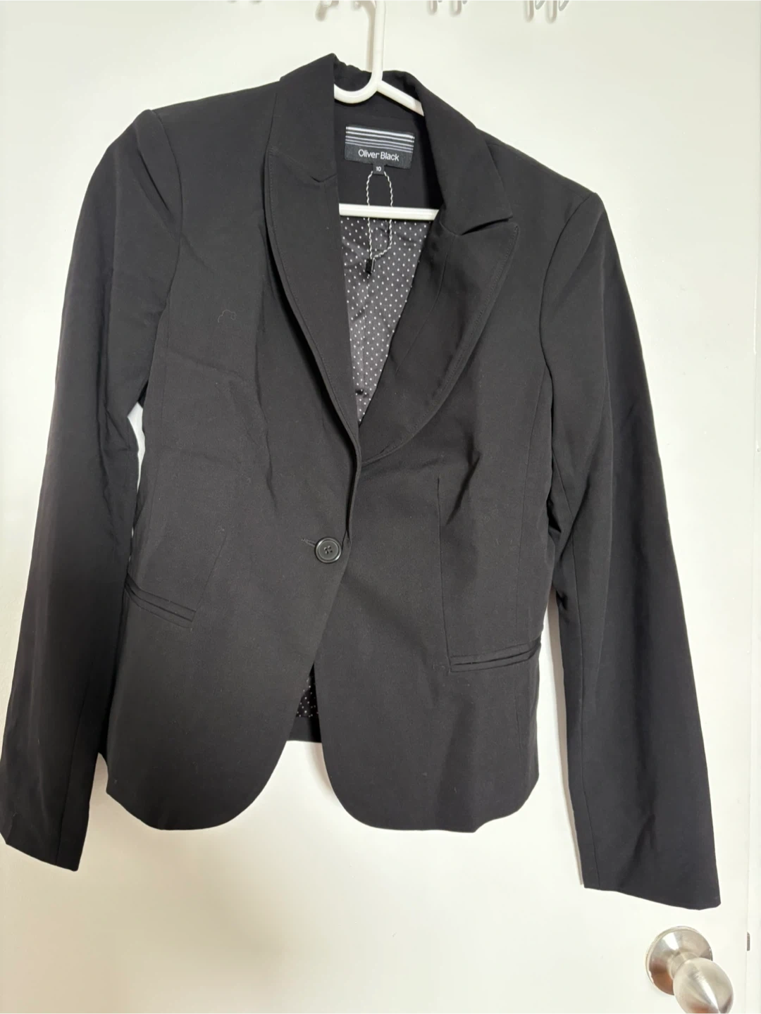 68Selling a stylish Oliver Black blazer in a size 10. The blazer is black and features a classic design. The inner lining has a fun polka dot pattern. It's in great condition and ready for a new home! I’ve never worn it; it’s completely new.