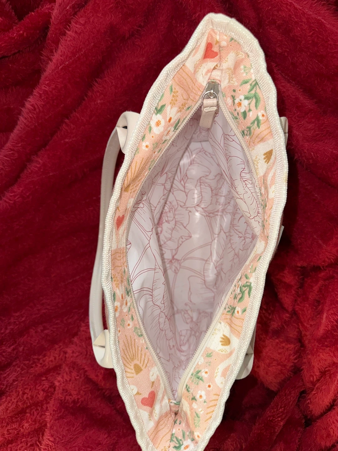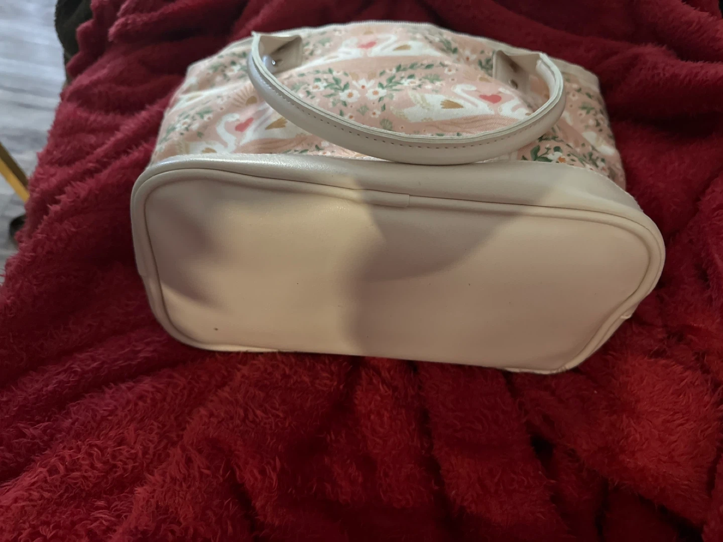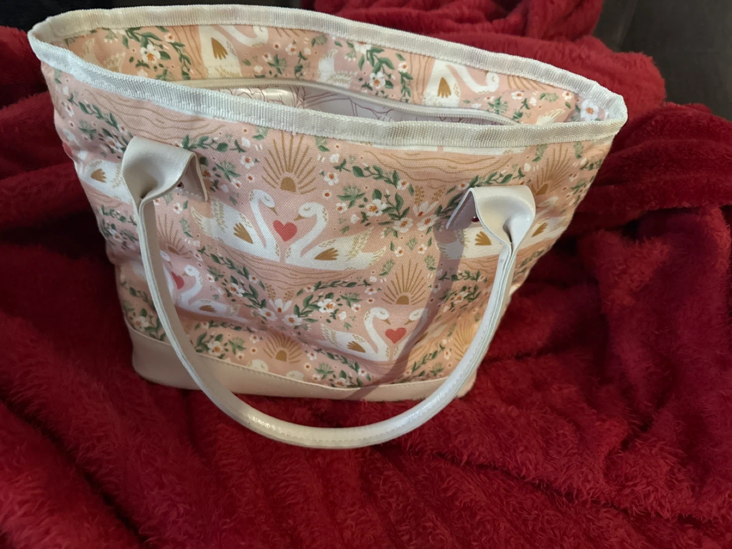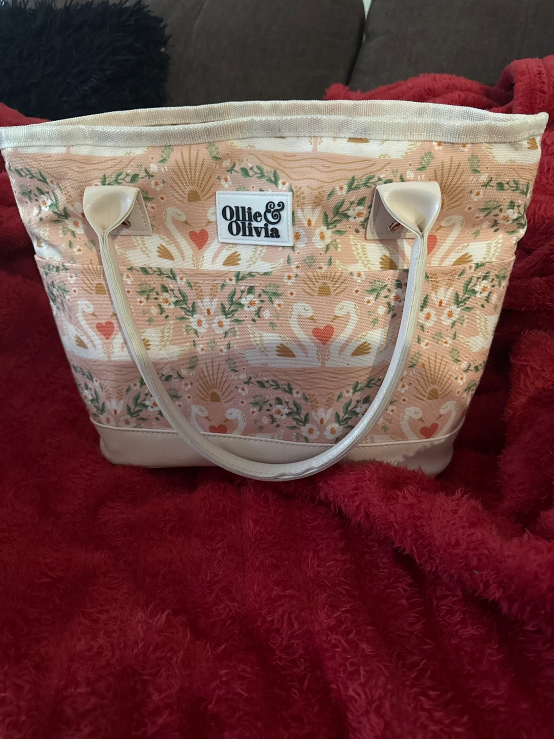 Selling a cute Ollie & Olivia tote lunch bag! It features a lovely swan and floral pattern in soft pink and white. The bag has a zippered closure and comfortable handles. Lined inside to be easily cleaned. Perfect for everyday use!