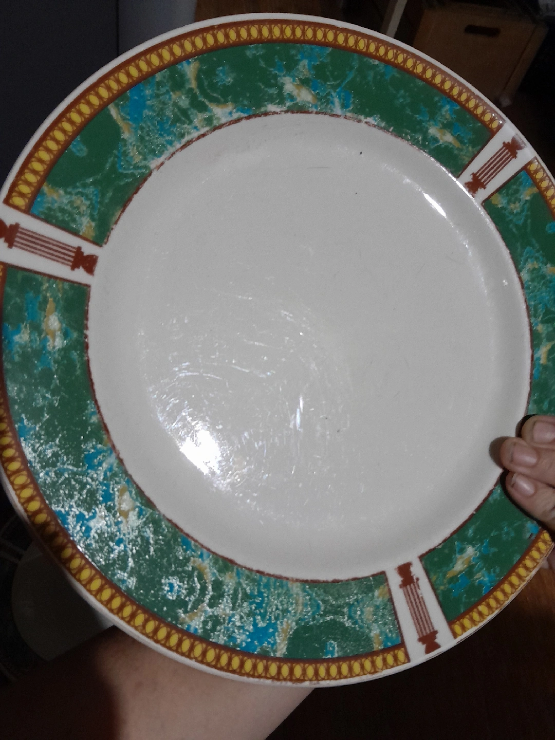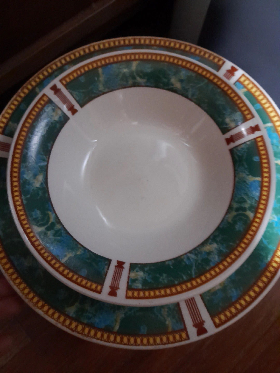 Selling a set of Olympia stoneware china plates. These plates are dishwasher and microwave safe. The design features a green and blue marbled pattern with gold and red accents around the rim. They're great for everyday use or special occasions! ( 3 dinner plates and 1 bowl)