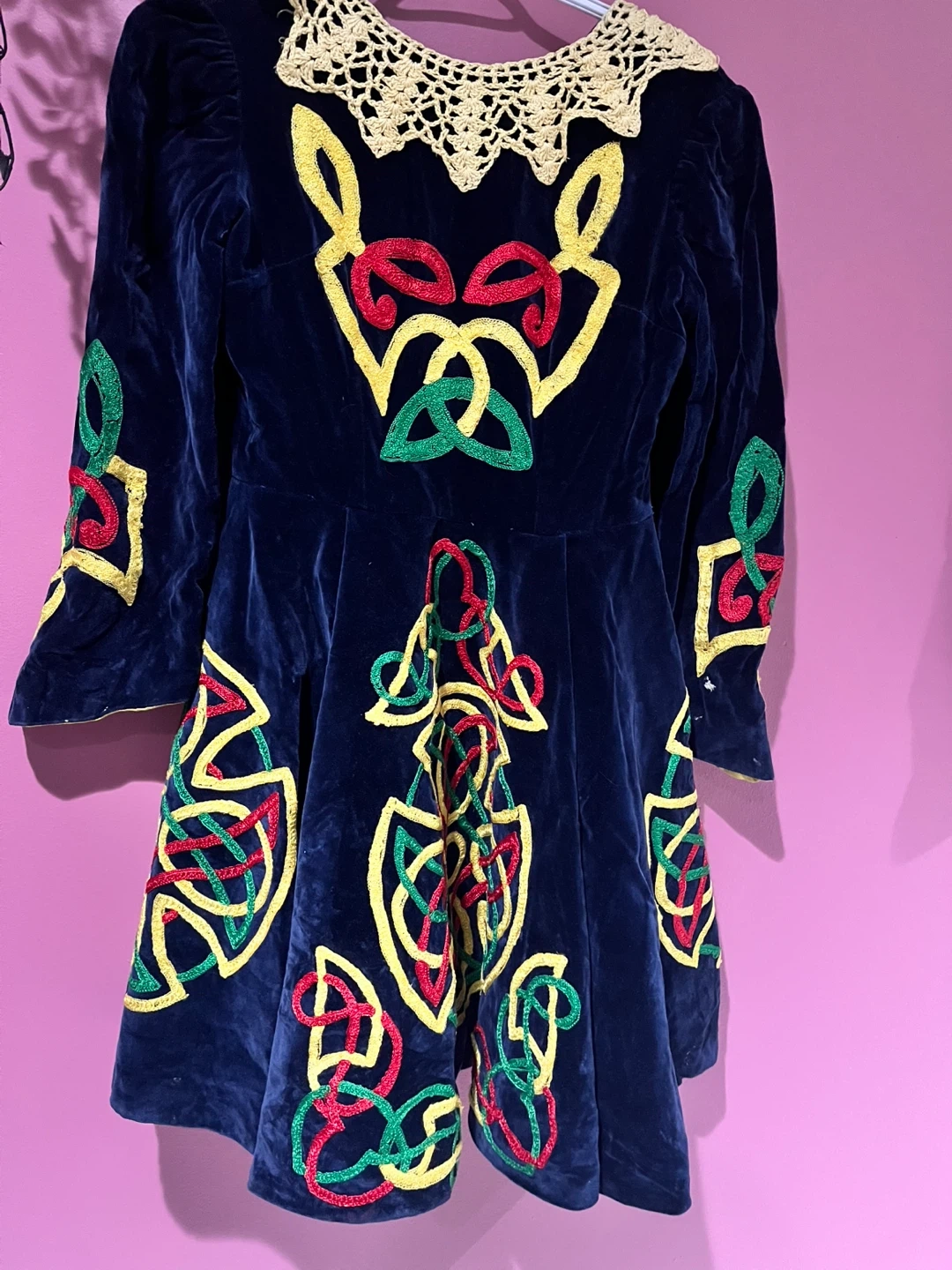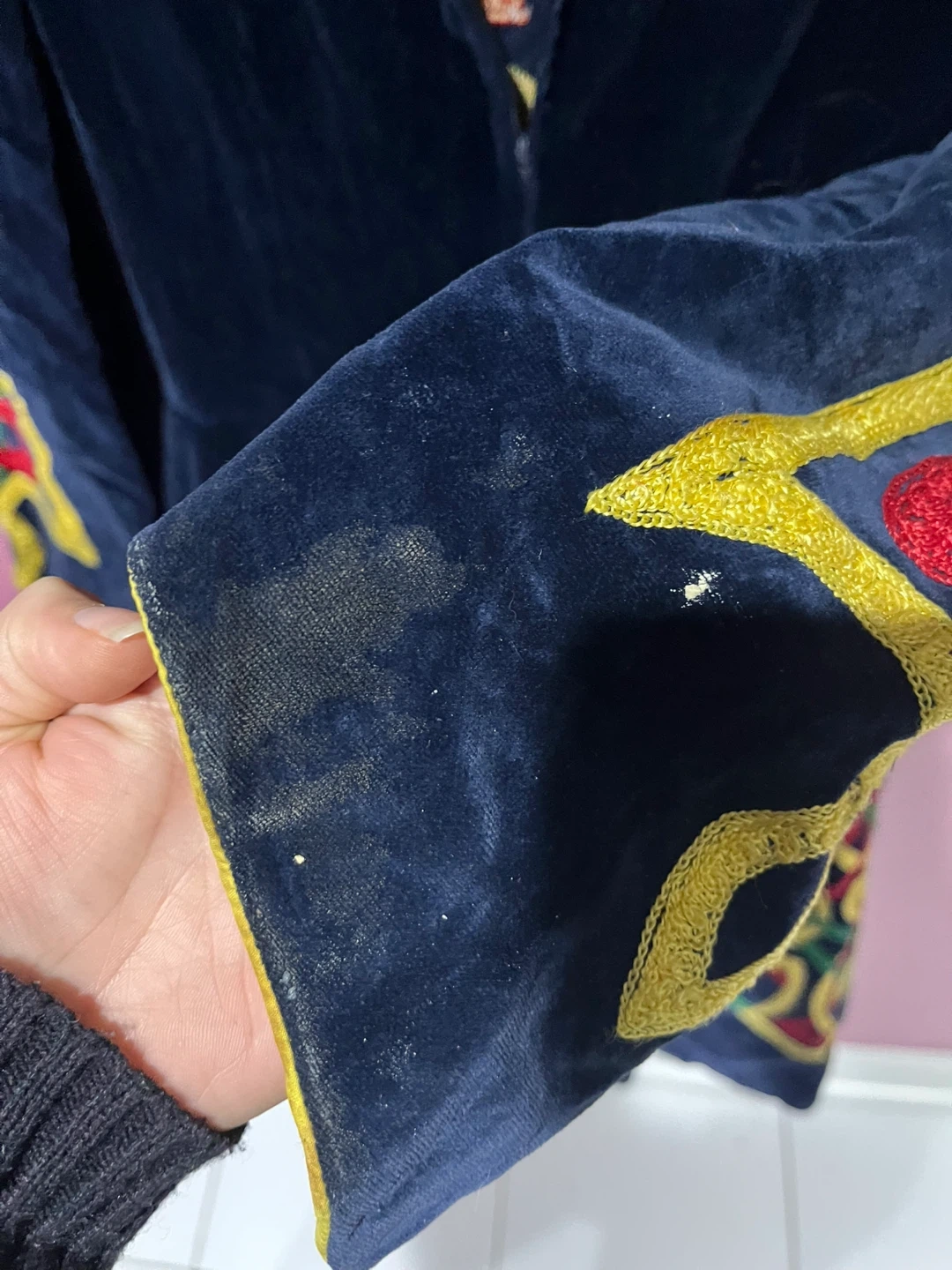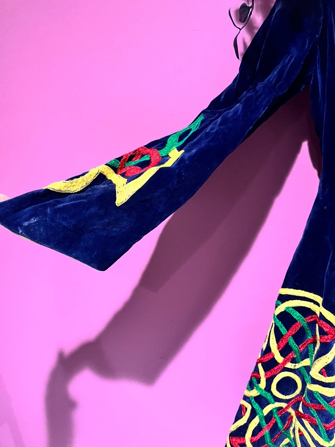 Beautiful velvet dress featuring intricate embroidery in red, green, and yellow. This is a true beauty of a vintage dress - it’s heavy. There’s a tear in the back but can be fixed if you sew.