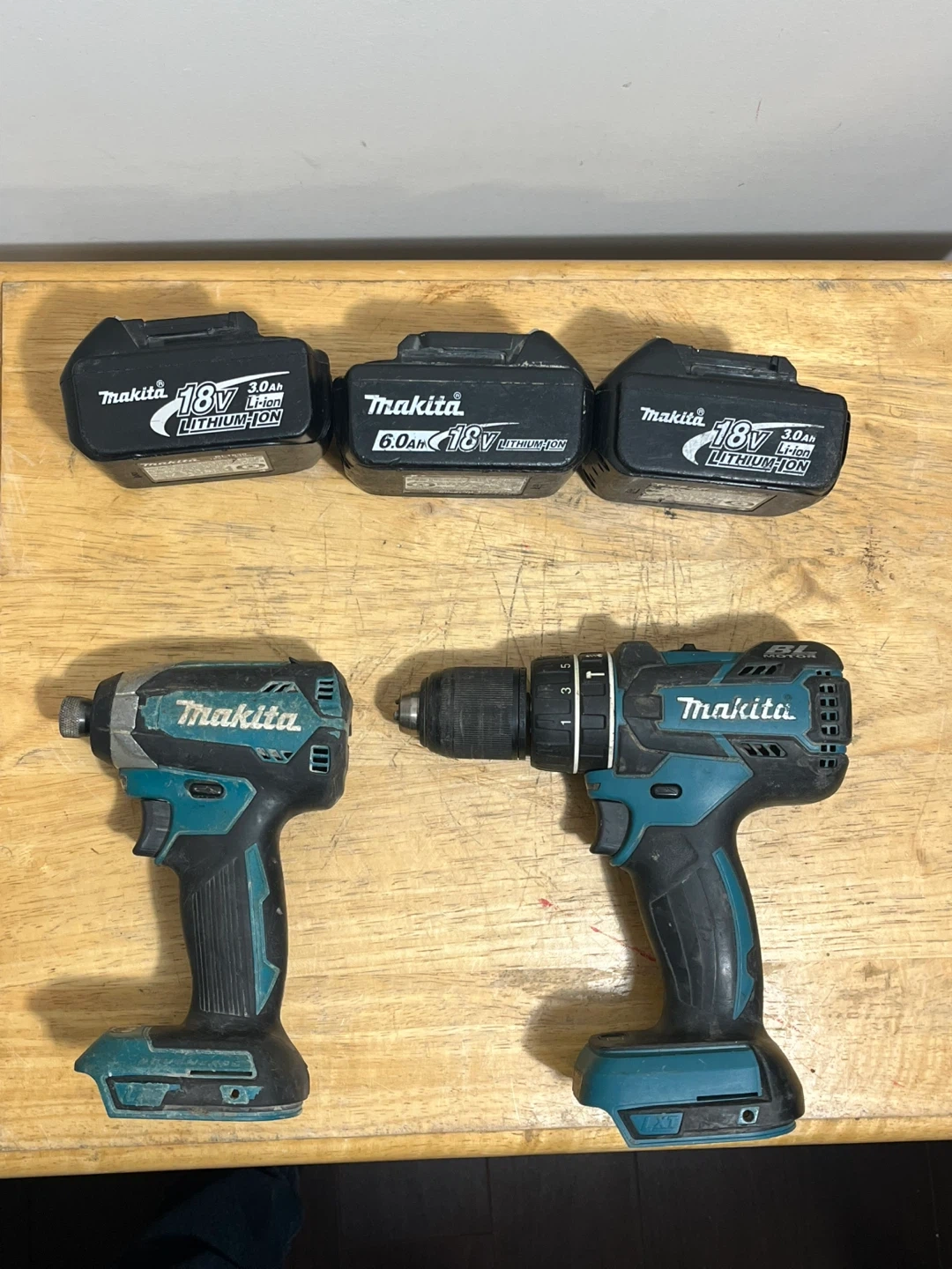 This set includes two Makita cordless drills and three 18V lithium-ion batteries. Three batteries are 3.0Ah and one is 6.0Ah. These drills are great for various DIY and professional tasks.
