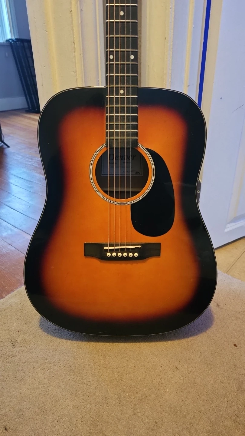 Denver acoustic guitar in a sunburst finish. Model DD44S-SB. It's a dreadnought style acoustic. This guitar is well-suited for beginner musicians or those looking for an affordable acoustic option.