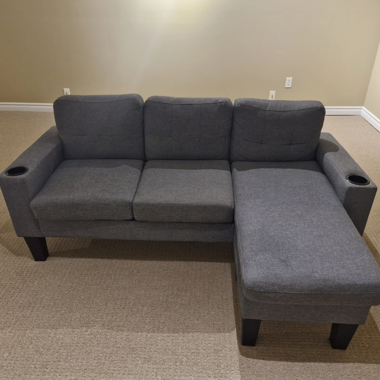Grey fabric 3-seater sectional sofa with a chaise lounge. It has built-in cup holders on both armrests. This couch provides comfy seating for your living space
