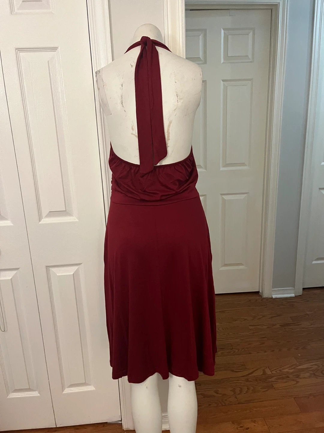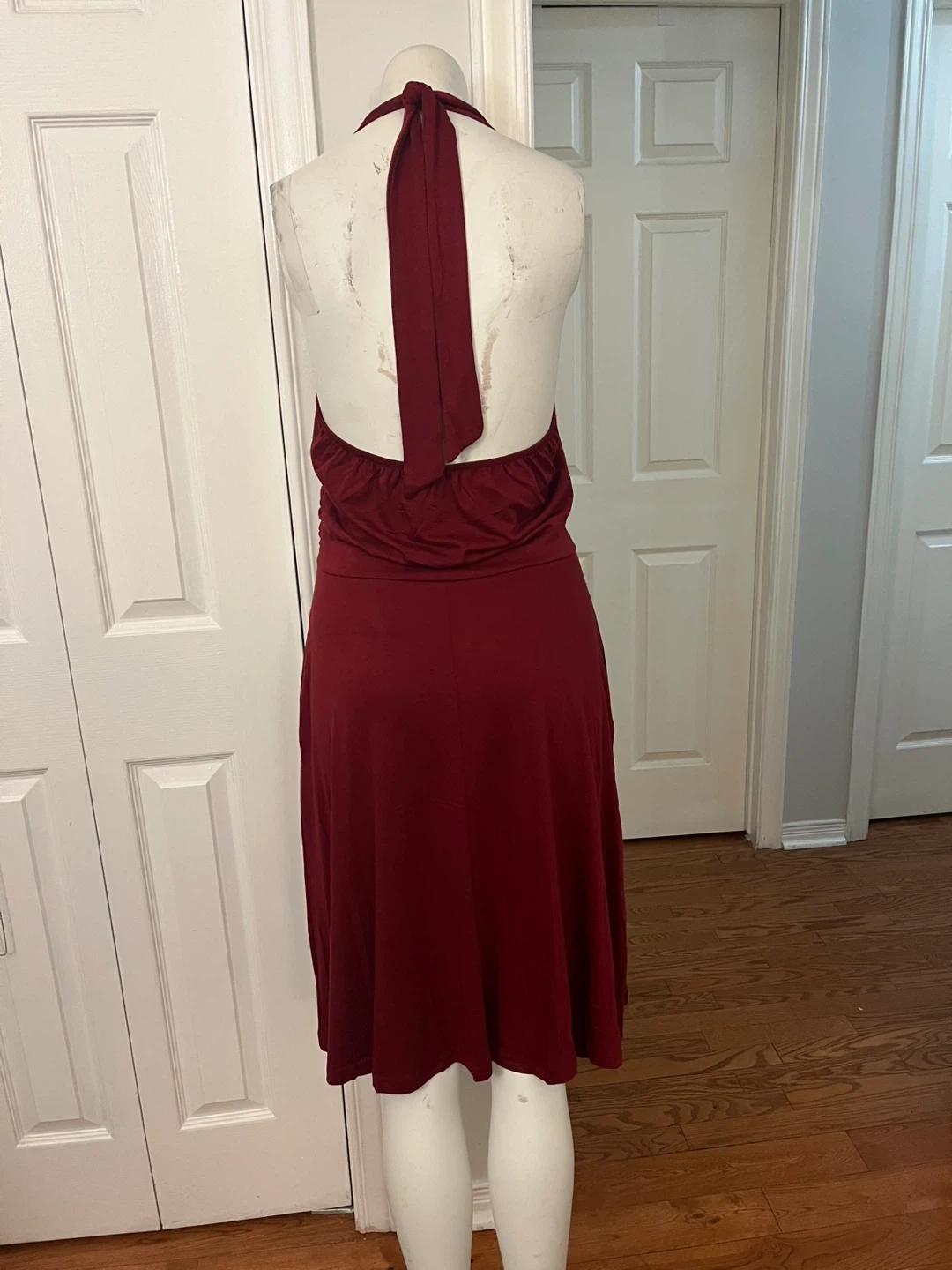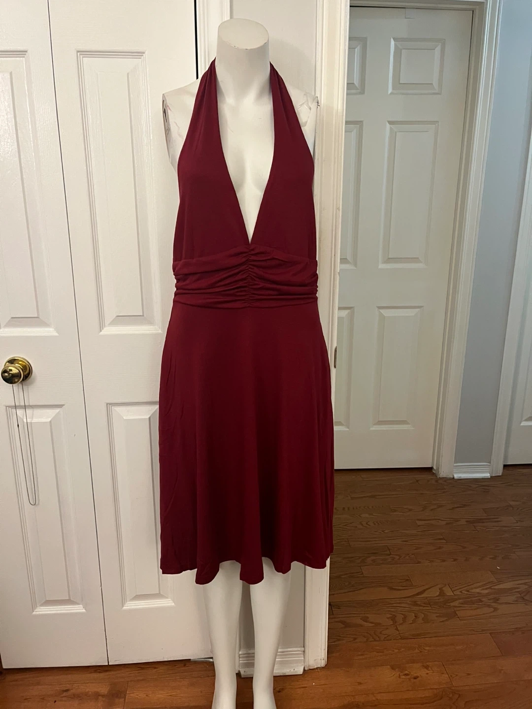 A maroon halter neck dress with a deep V-neck and ruched detailing at the waist. The fabric is a soft, stretchy material. It's a knee-length style with a flattering fit, and 2 pockets
