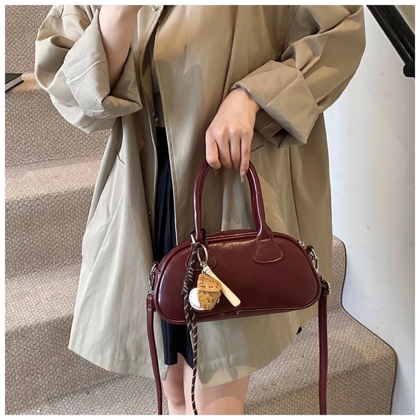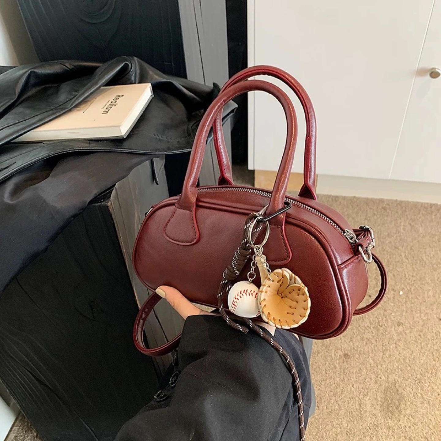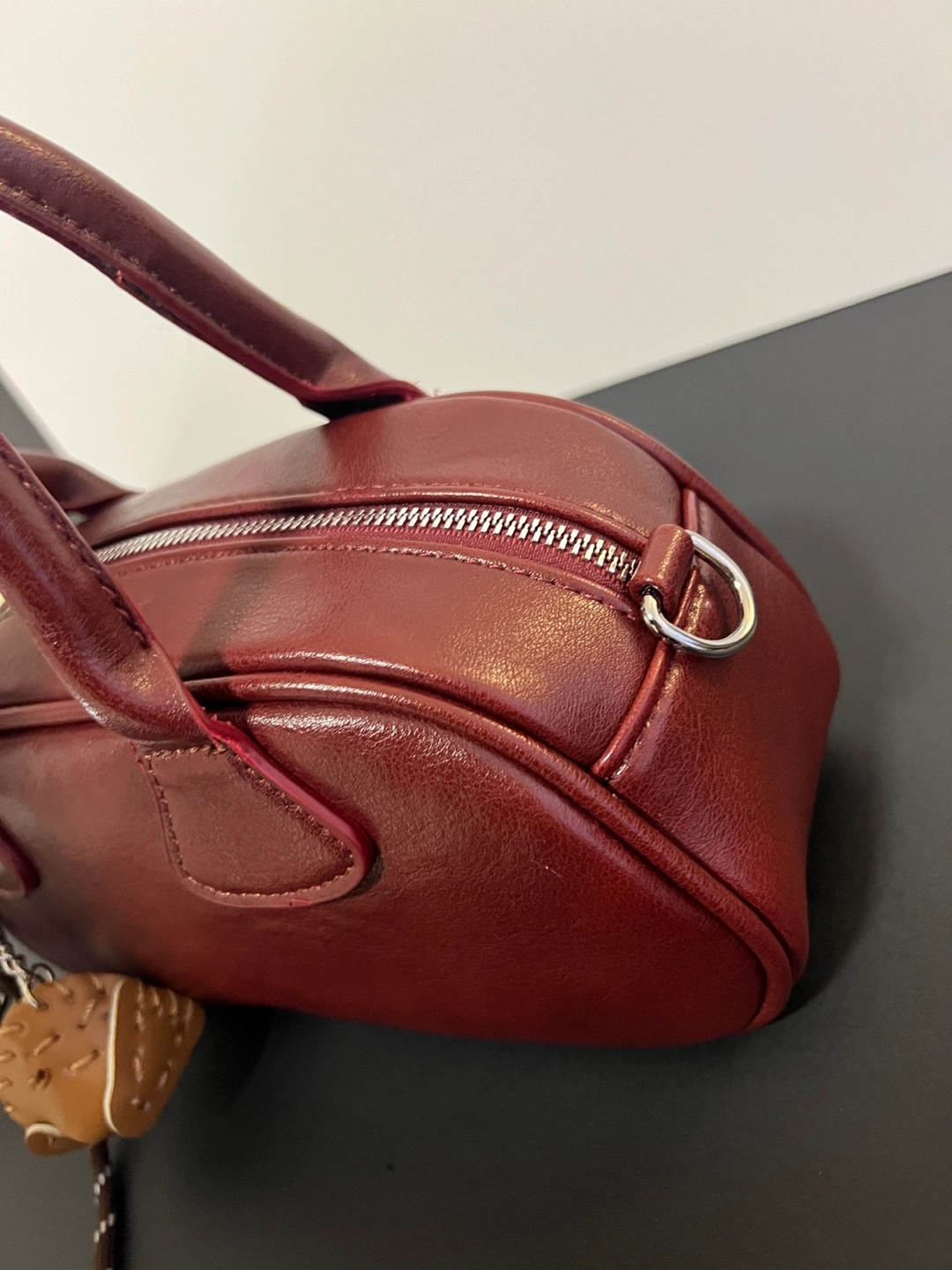 Burgundy Mini Satchel Bag with Baseball Keychain