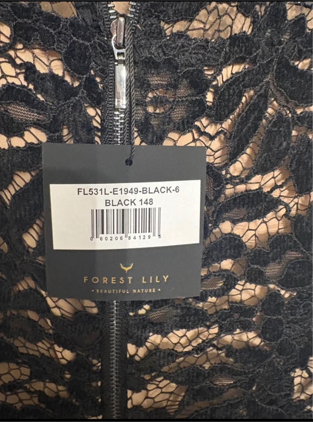 This is a beautiful Forest Lily dress, brand new with tags! It features a lovely black lace overlay and is a size 6.