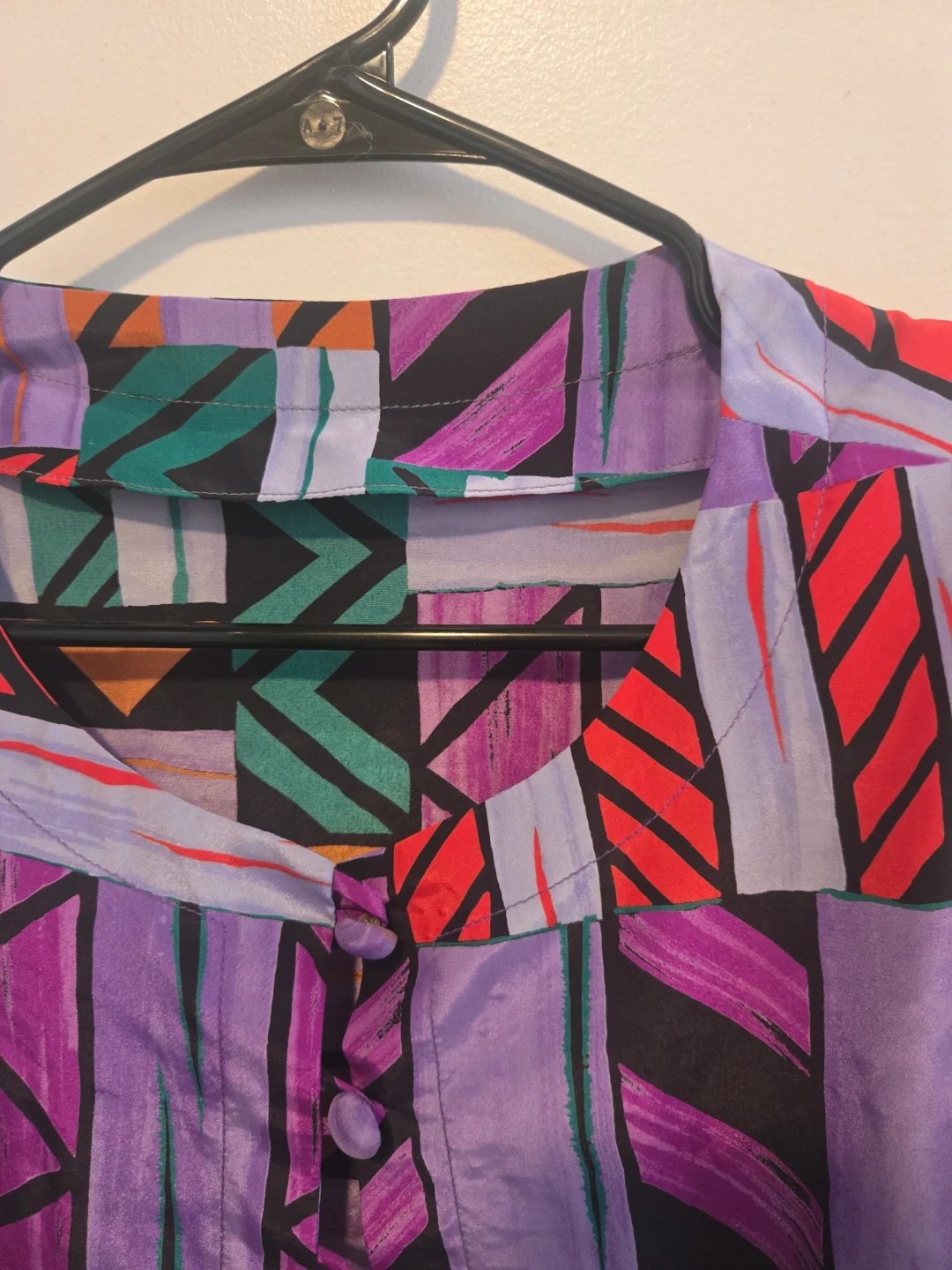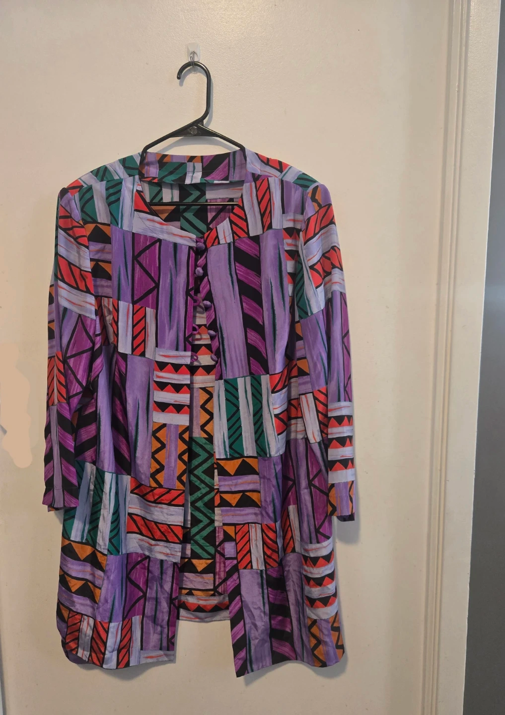 Geometric print in shades of purple, orange, red, and green. It's a button-up style with a V-neckline and long sleeves. Fits Medium and Small.