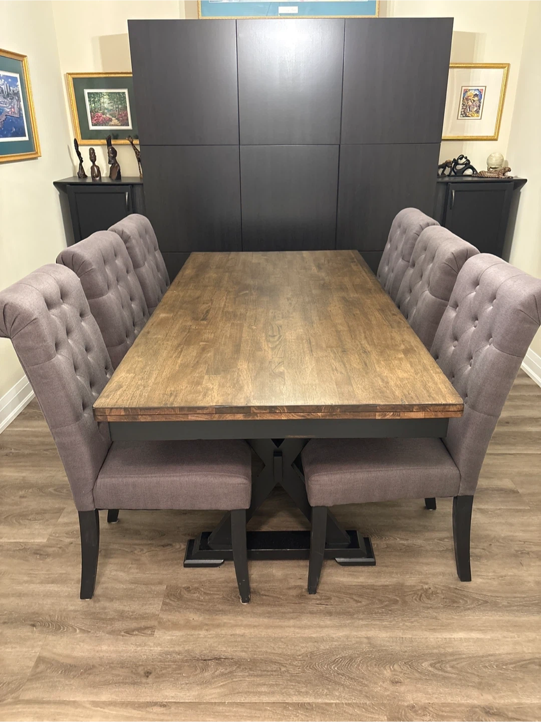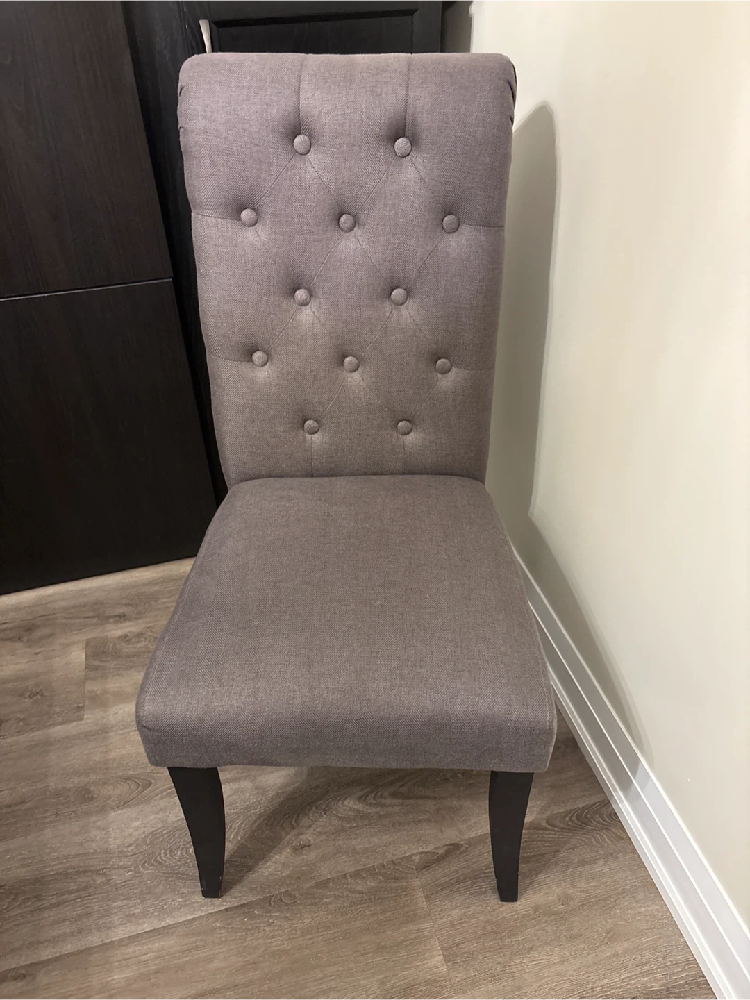 Set of six upholstered dining chairs in a neutral grey fabric. These chairs feature tufted backs and comfortable cushioning. The dark wood legs complement the tufted design. They're ready to add a touch of elegance to your dining space! Like new.