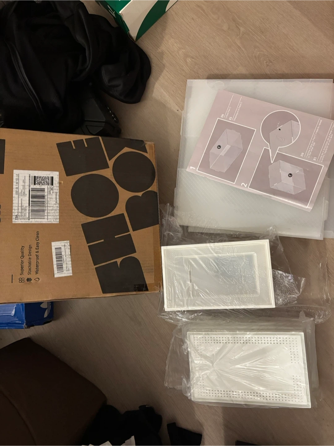 Selling a set of stackable shoe storage boxes. They are waterproof and easy to clean, perfect for keeping your shoes organized and protected. The box includes instructions for assembly + 12 individual size 9 Boxes. Get your shoes organized today!