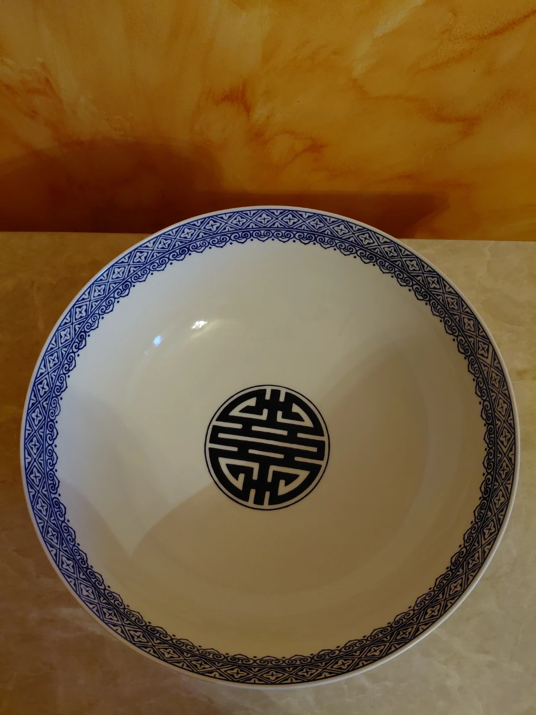Bombay decorative bowl with blue and white floral pattern. This bowl is made in China and is not safe for food use. It's a beautiful piece for display.