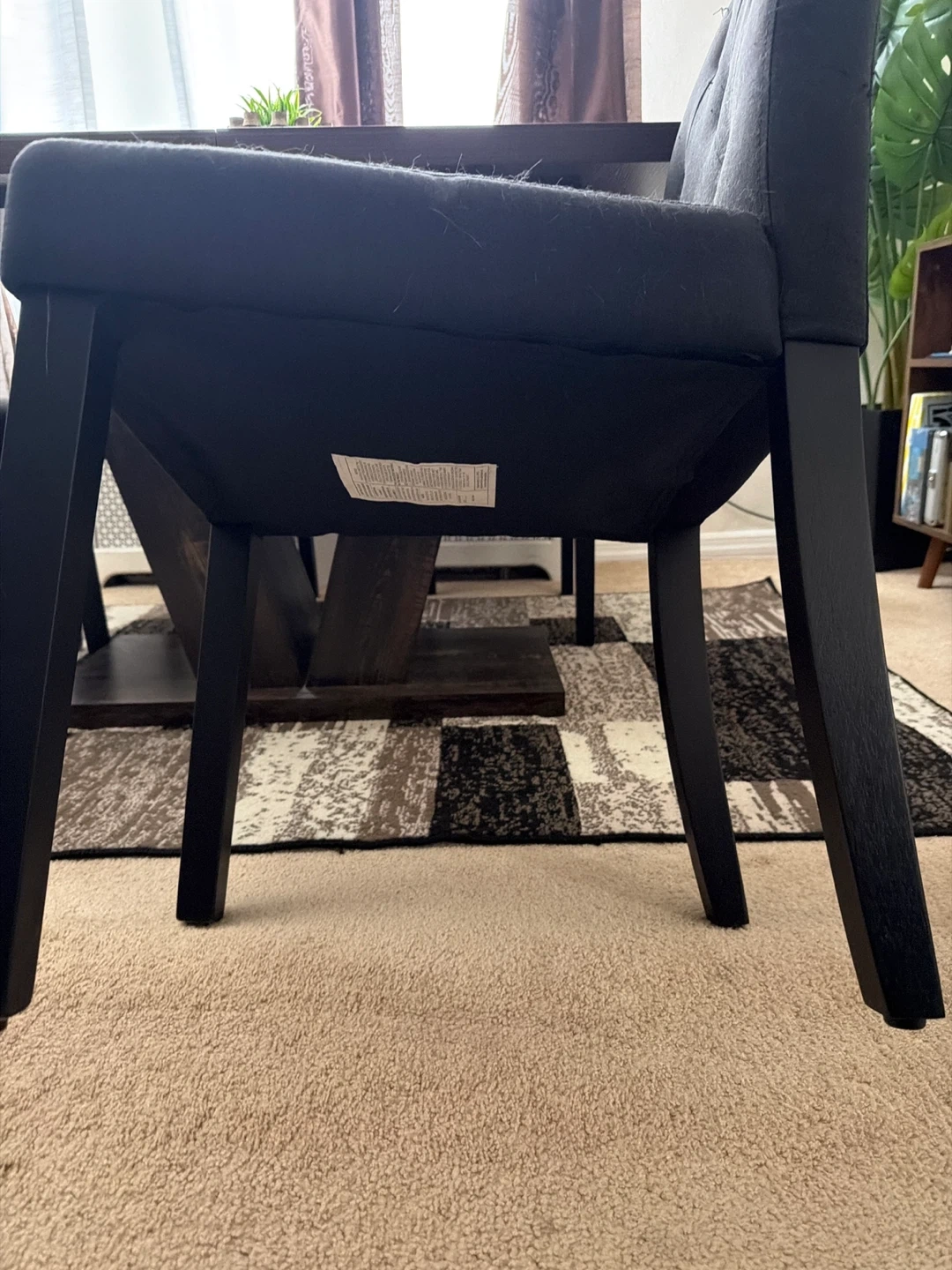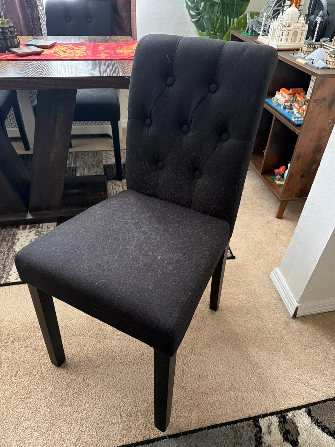 This is a black upholstered dining chair with a tufted backrest. It features wooden legs and a comfortable seat cushion. The fabric appears to be a textured material. The way are preloved. I have two cats that have enjoyed them more than me. Need work done.