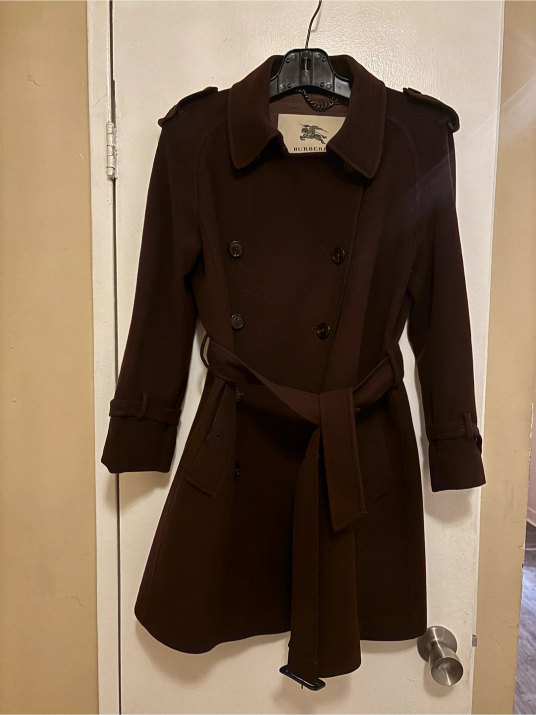 Burberry London trench coat in a deep plum colour. Double-breasted front with a belted waist. Made in Italy. Wool cashmere blend. Size 42 Italian (size 6)