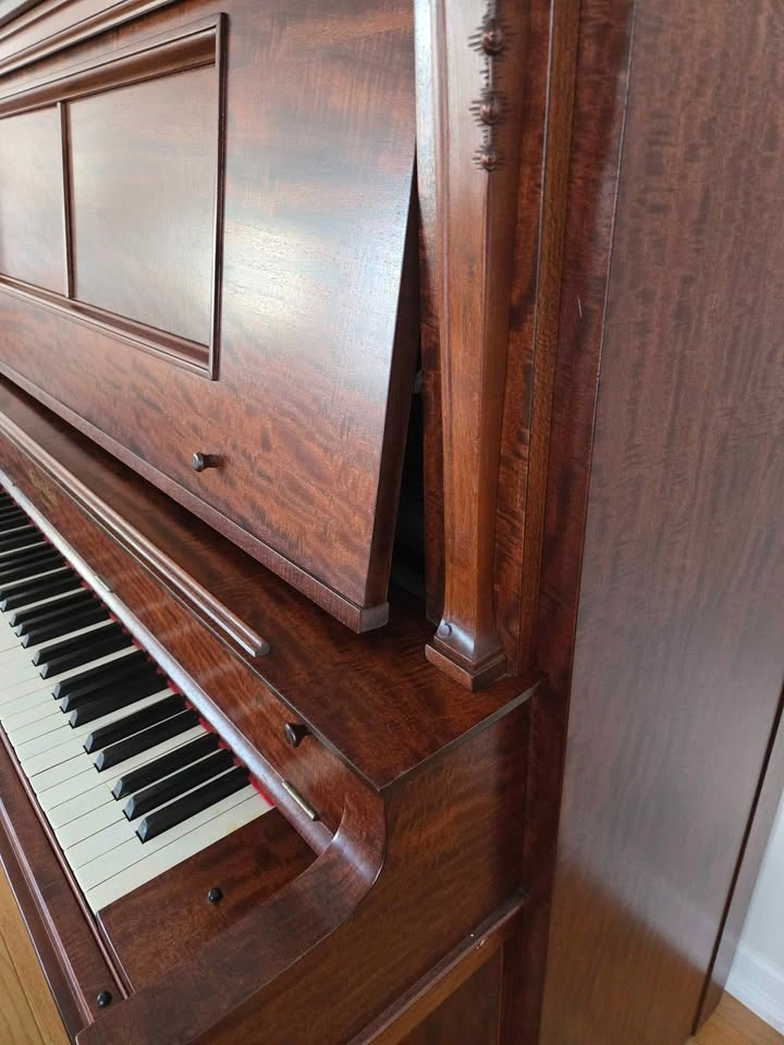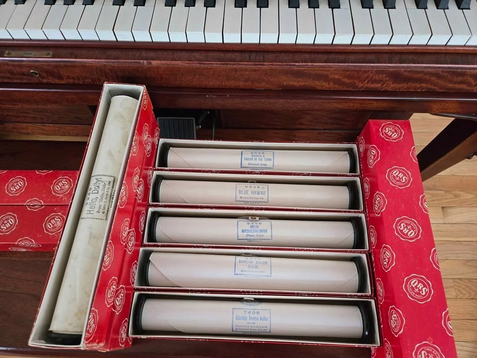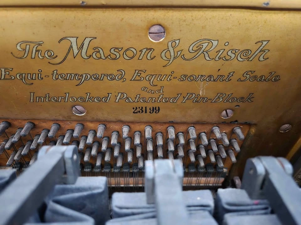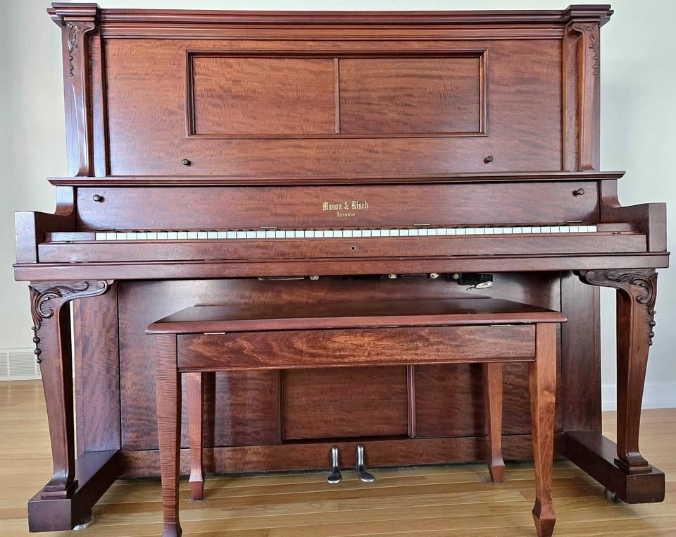 Beautiful refinished player piano by renowned Canadian piano makers, Mason and Risch. Manufactured in the early 1900s, it is both rich in tone and a piece of history that will enliven your home. Very good condition. Play it as a standard upright piano or listen to the virtuoso stylings of famous pianists courtesy of interchangeable piano rolls. Great for family singalongs and party fun! Over 50 piano rolls included --- from ragtime tunes and polkas to more modern hits from the 60s and 70s. The piano is 64" wide, 54 1/2 inches tall, and 30" deep. Matching bench with storage is 36" wide and 21" high. $2200 or best offer.