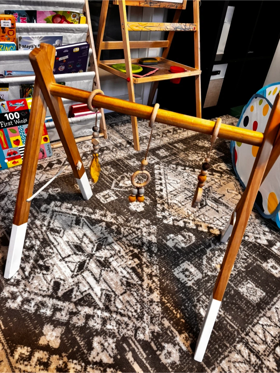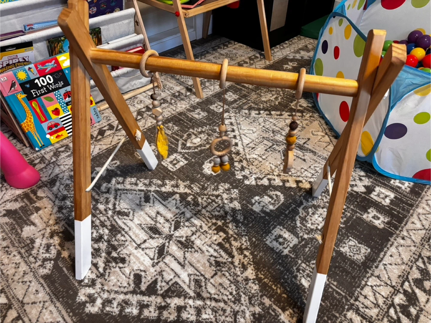 This is a wooden baby play gym. It features a natural wood finish with white accents on the legs. Three wooden toys hang from the top bar, including beads, a leaf shape, and a small spoon-like object. It's designed for babies to explore textures and shapes. You can add more hanging toys if you wish. I used this overtop of my baby while changing diapers to distract him.