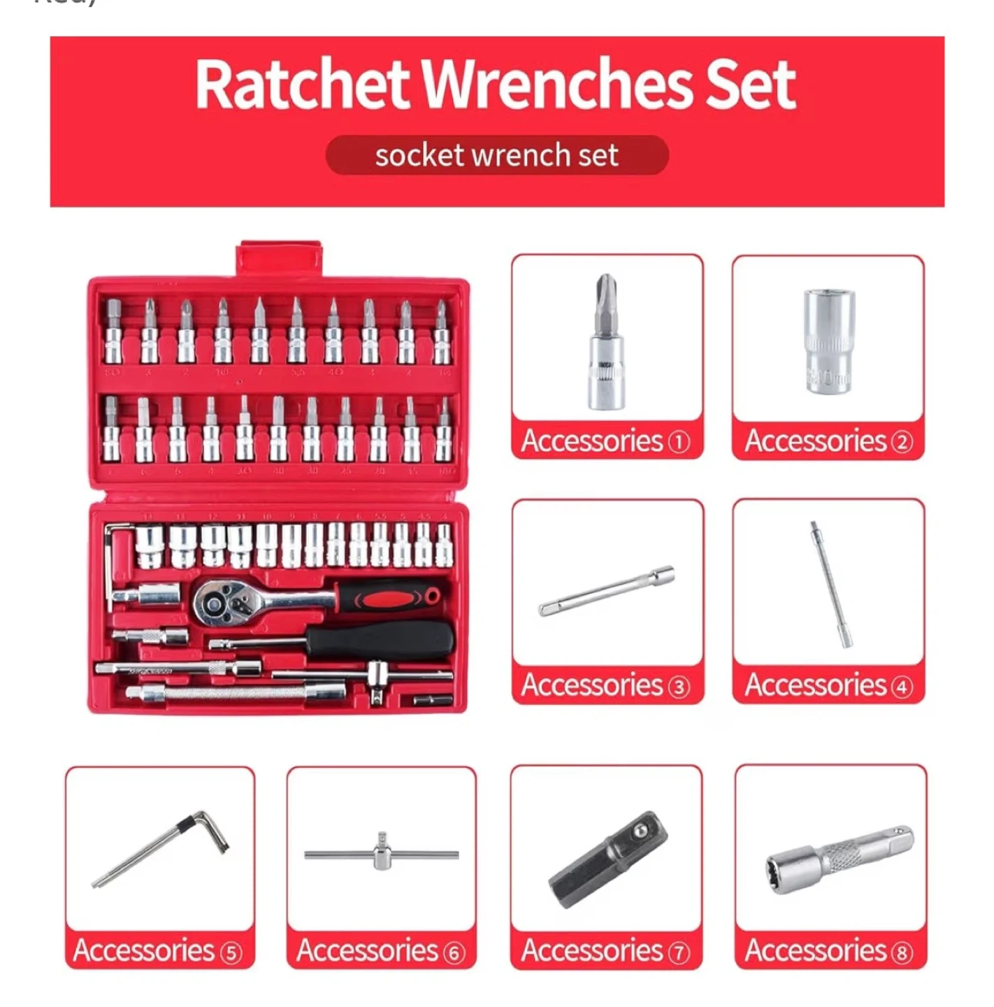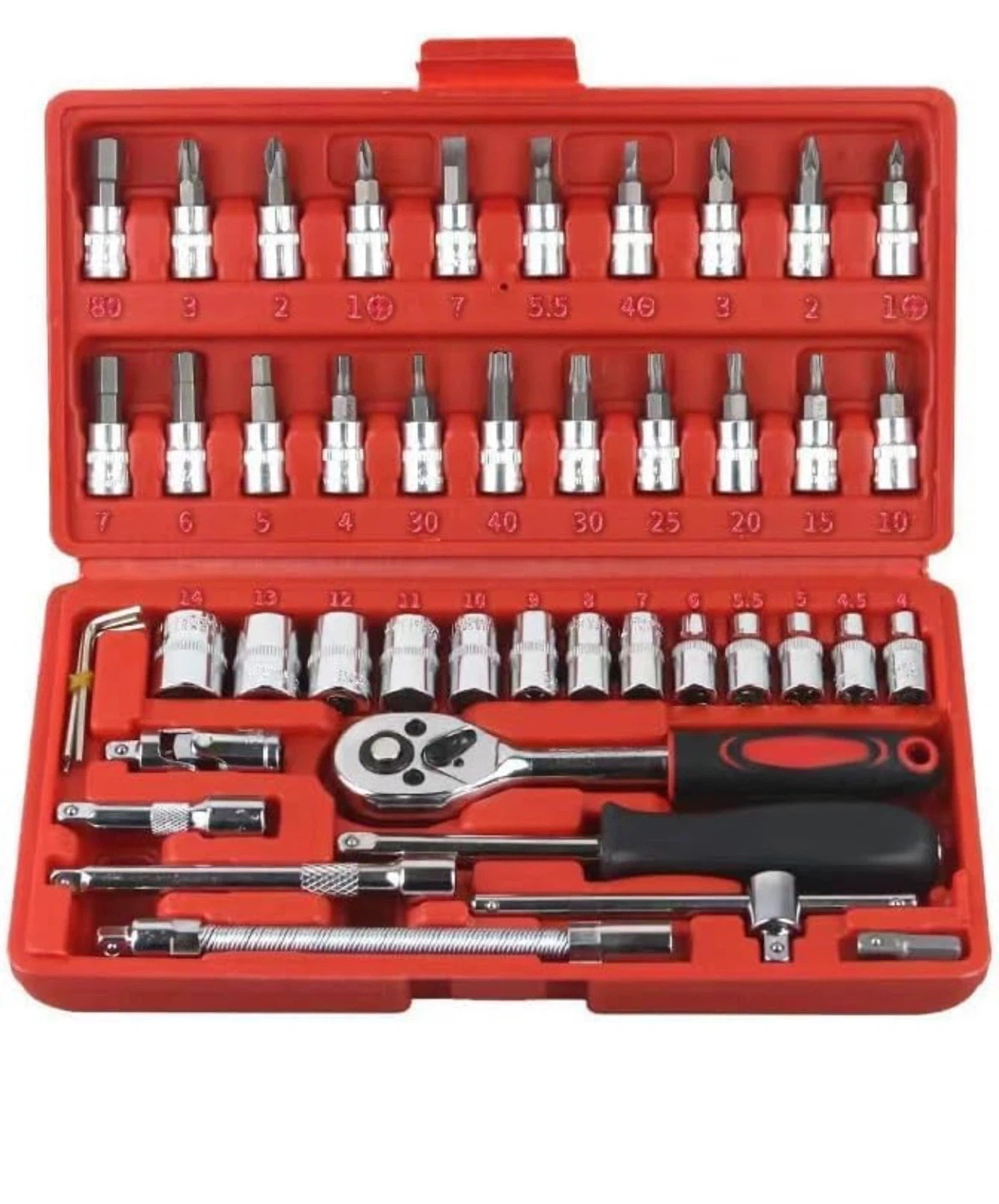 This 46-piece socket wrench set features a 1/4" drive with a quick ratchet handle. It includes various sockets, bits, extension bars, and adapters. This set is suitable for car repair, bicycle repair, and home repair tasks.