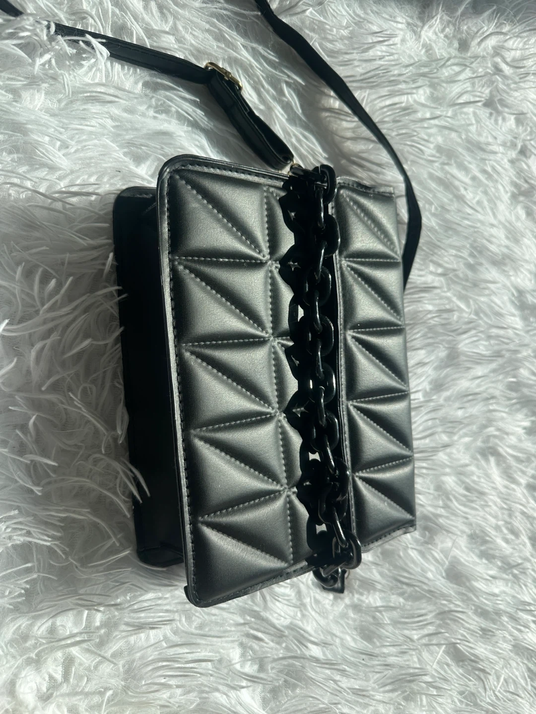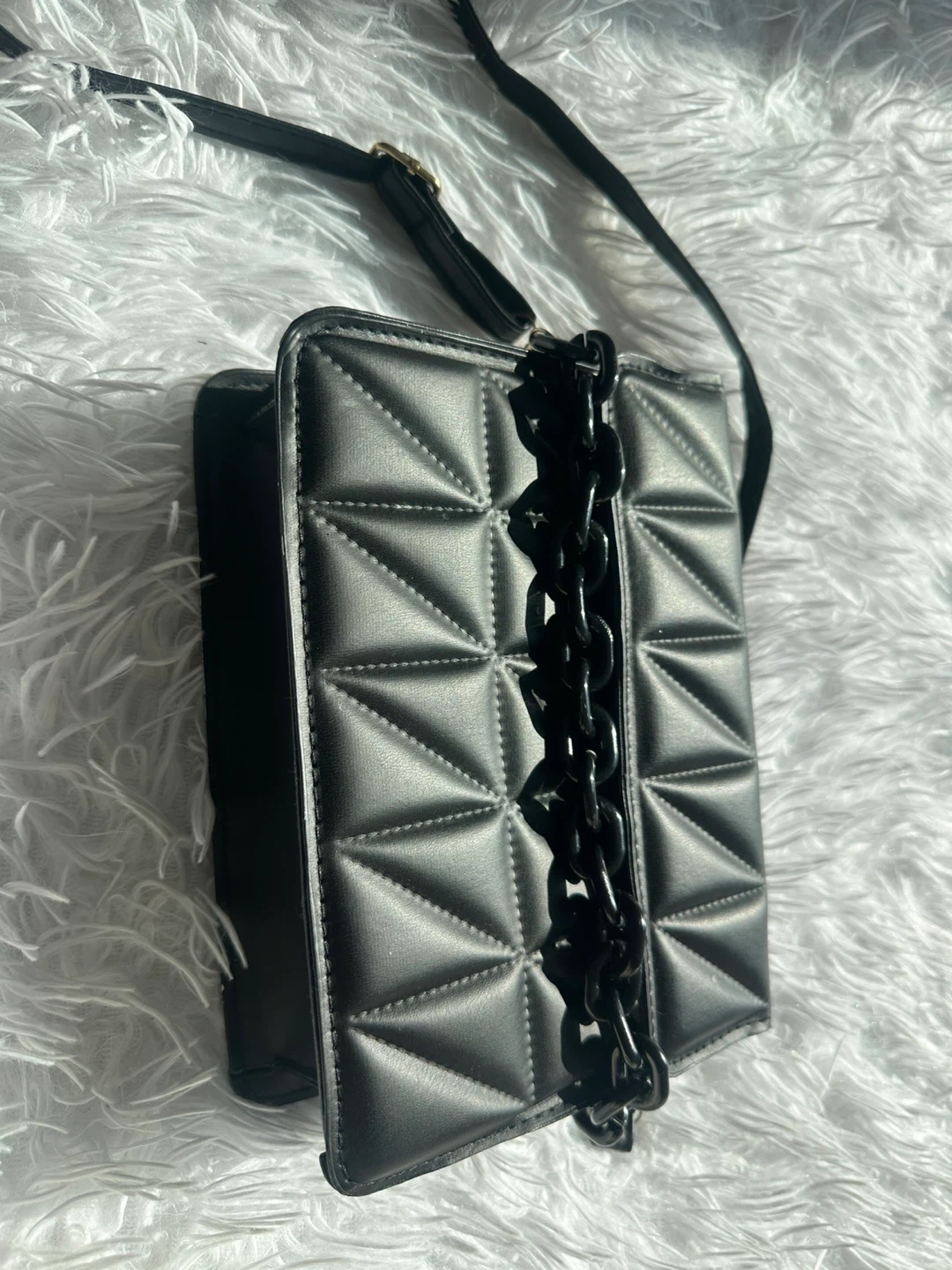 This stylish crossbody bag features a chic black quilted design with a bold black chain accent. It's perfect for carrying your essentials on the go. The faux leather material offers a sleek look and feel.