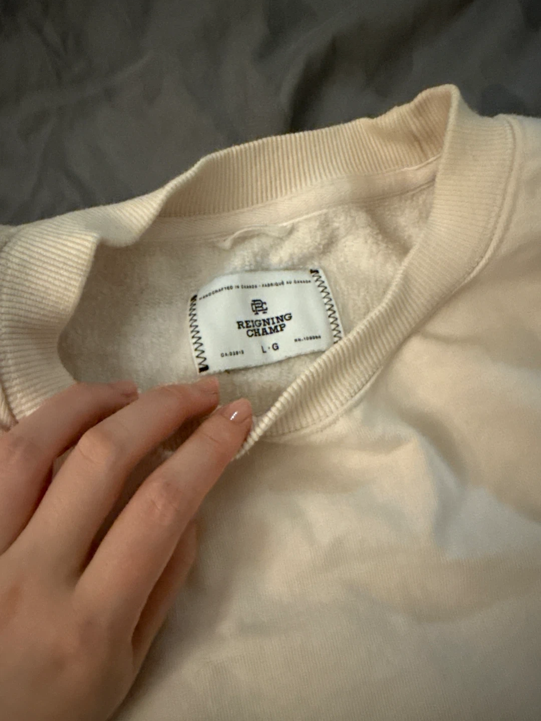 A classic cream crewneck sweatshirt from Reigning Champ. Crafted in Canada, it's a Men size large. I wear it foe oversize style. Made with durable materials for everyday wear.