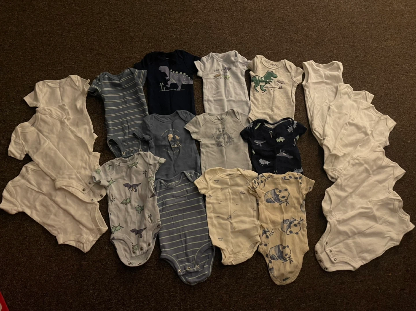 A collection of 15 newborn baby onesies in various styles. Includes dinosaur, panda, and striped patterns. Mostly short-sleeve designs with a few long-sleeve options. Assorted colors and sizes. They're made from soft cotton material. Great for everyday wear!