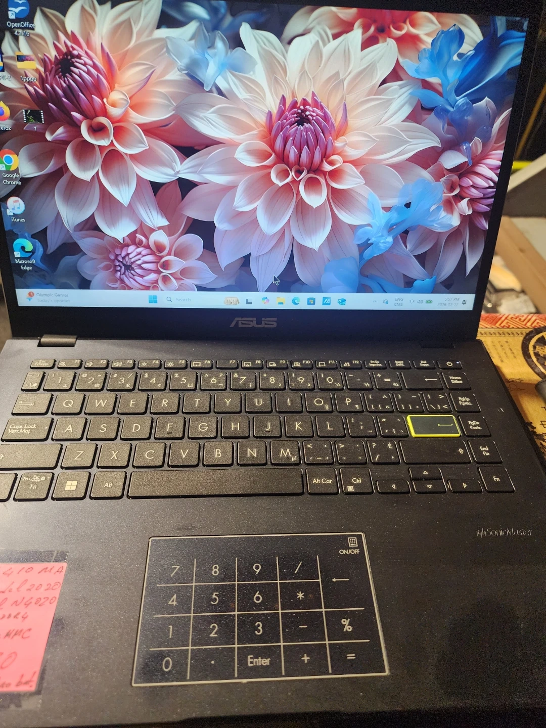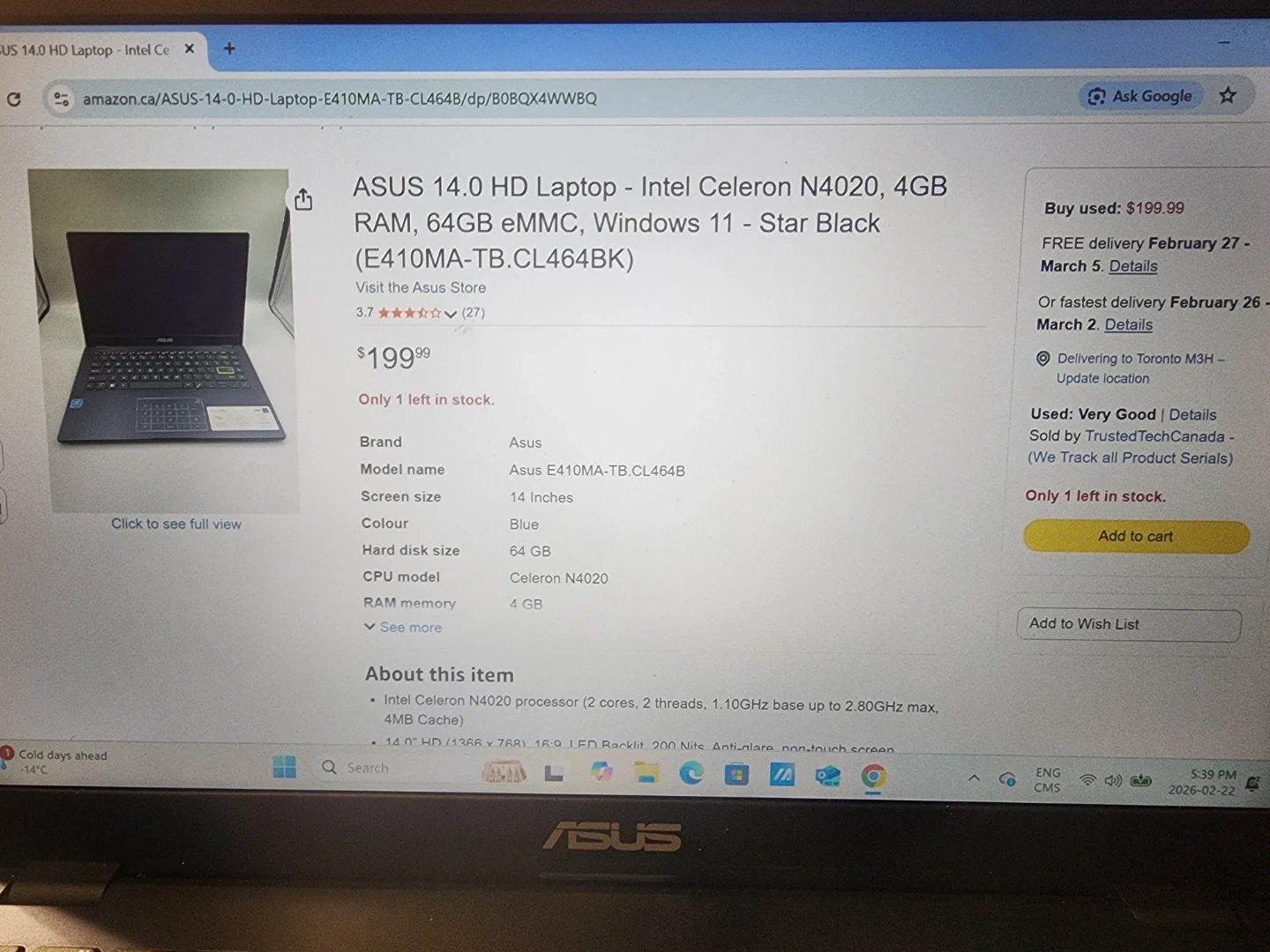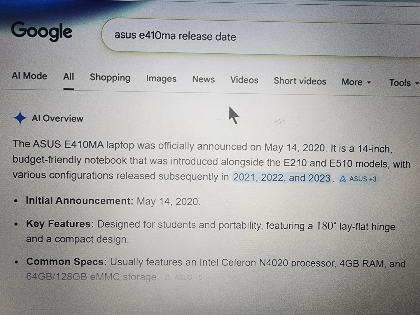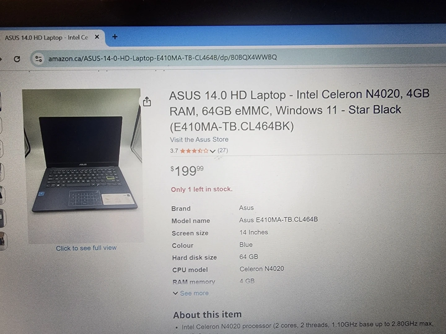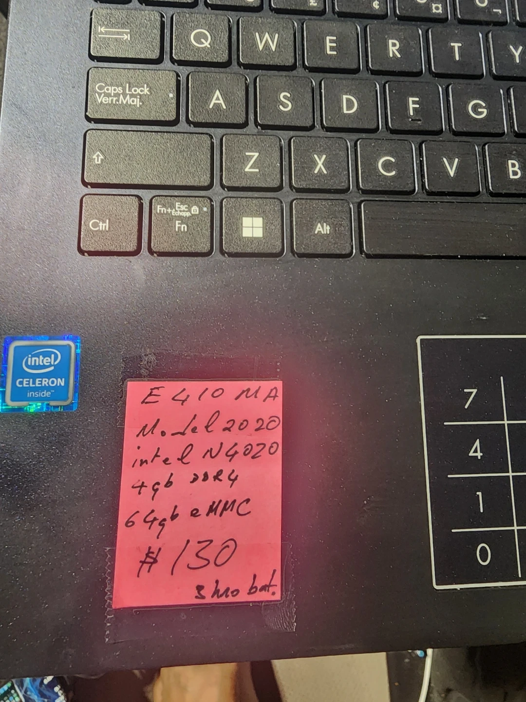 ASUS E410MA laptop from 2020. It's got an Intel Celeron N4020 processor, 4GB RAM, and 64GB eMMC storage. The battery has approximately 3 hours. This laptop is good for basic computing tasks.