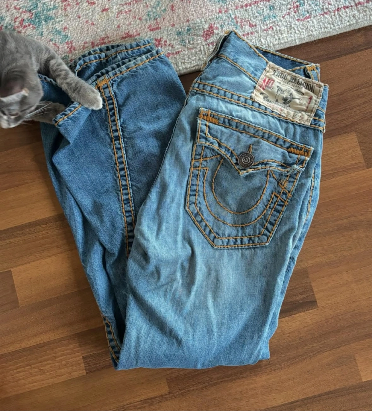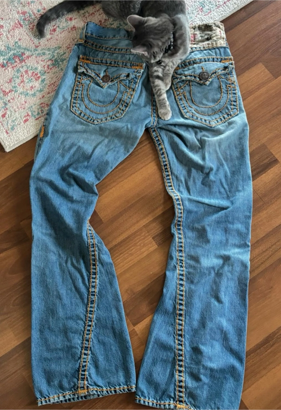 True Religion jeans in a light wash denim. These jeans have a distinct design with detailed stitching and the brand's signature back pocket flaps. They're in good condition and ready for a new home!