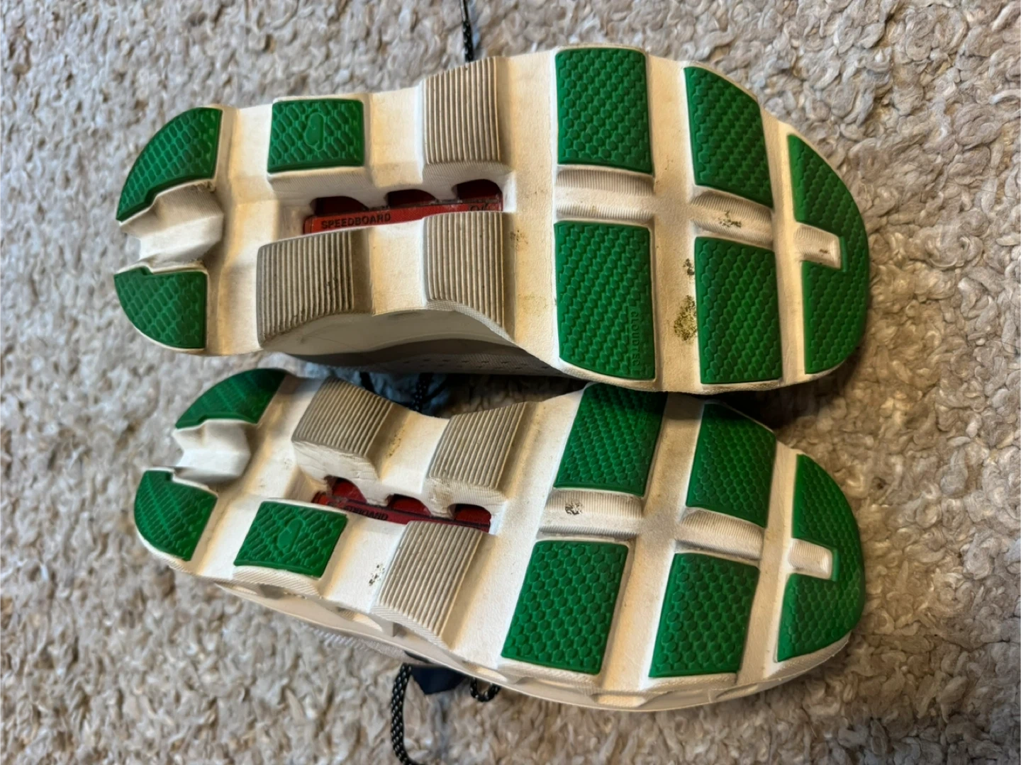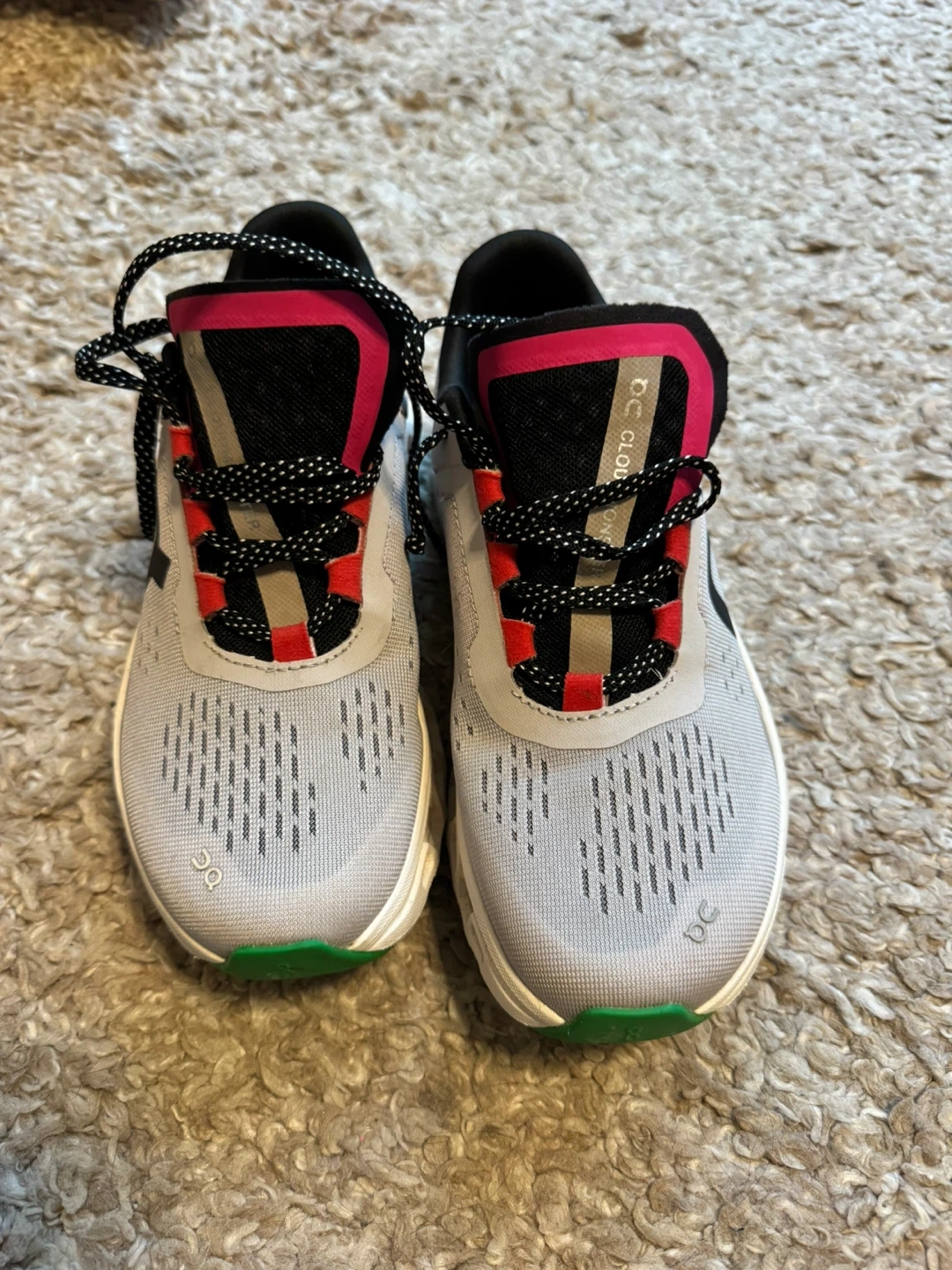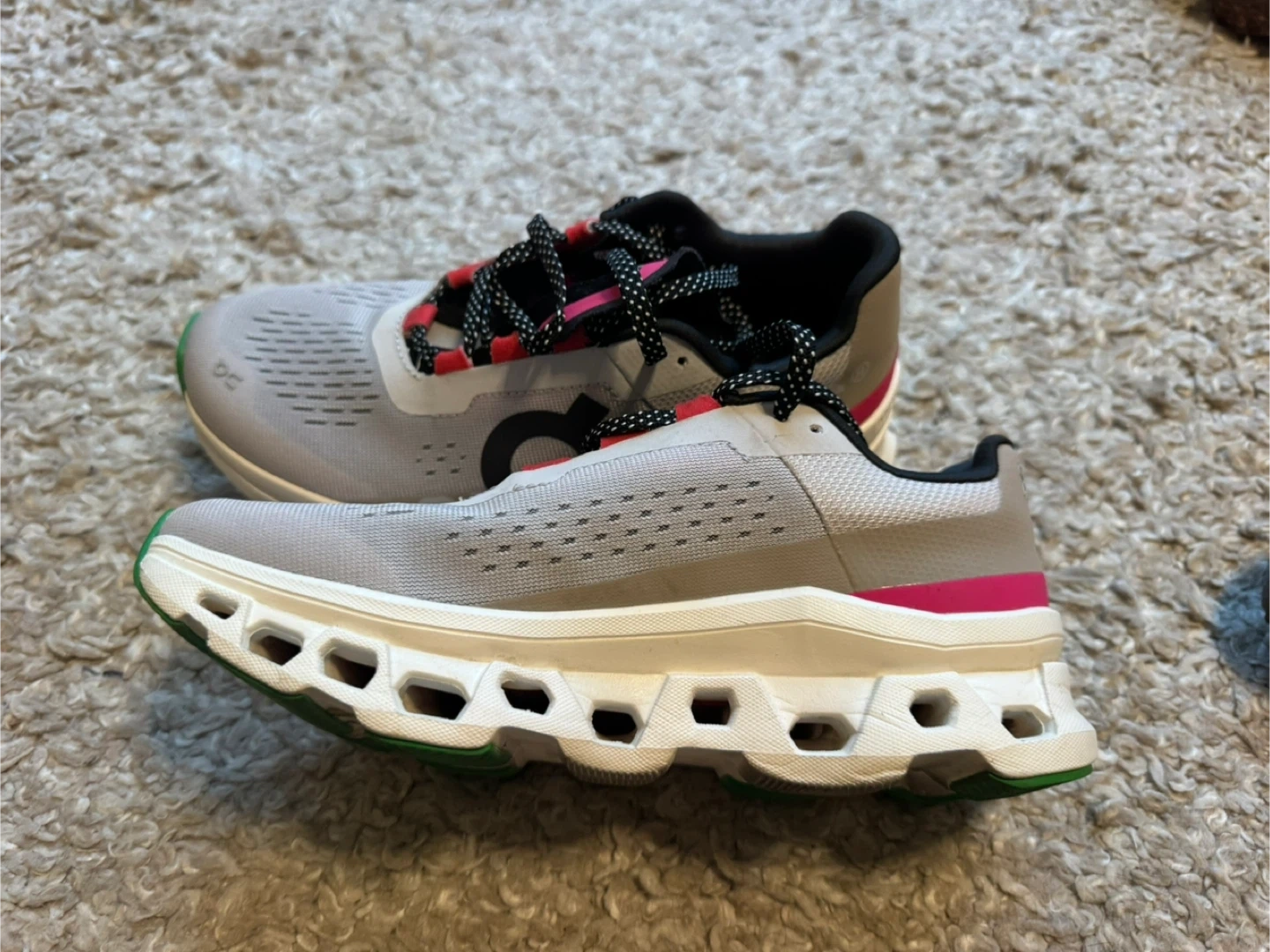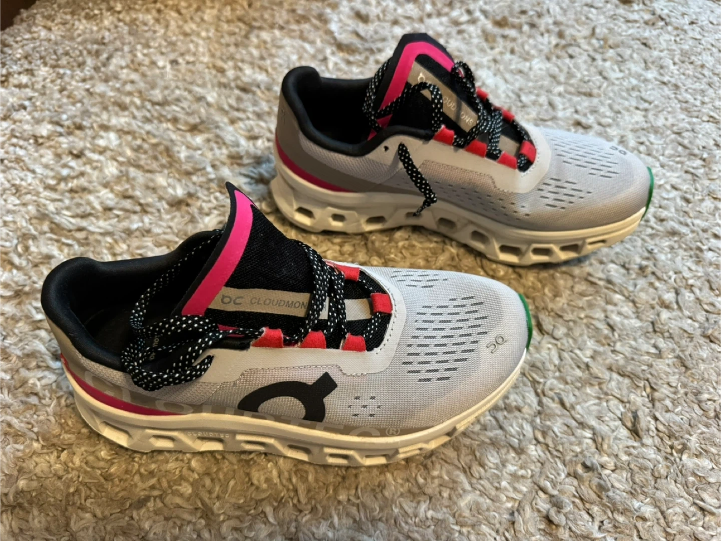 Selling a pair of On Cloudmonster women's running shoes in a lovely grey and pink colourway! They are a size 6.5 in US sizing. These shoes are super lightweight and portable, making them perfect for running or everyday wear. They have a very distinctive and comfortable sole. Don't miss out! The shoes have only been worn once for a 5k run. They were too small for my orthotic to fit in. That’s why I’m selling.