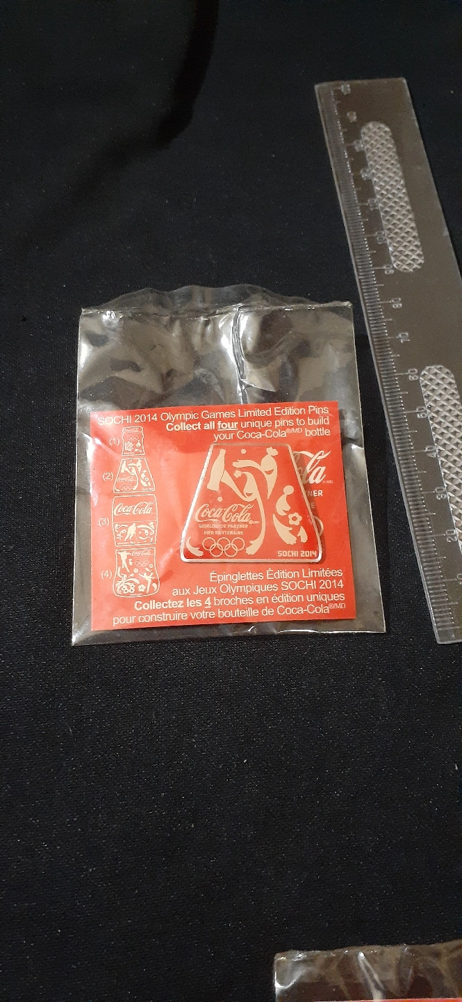 Limited edition Coca-Cola pin. Part of a four-pin set to build a bottle. Silver coloured pin. Manufactured by Sunscope. Distributed by Staples Promotional Products.