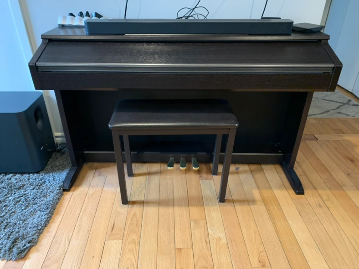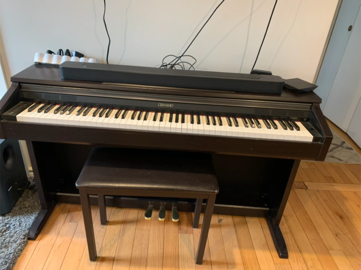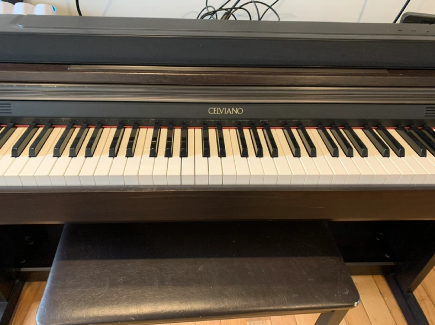 This is a Casio Celviano digital piano. It comes with a matching bench and pedals. The dark wood finish looks great in any room. Make an offer.
