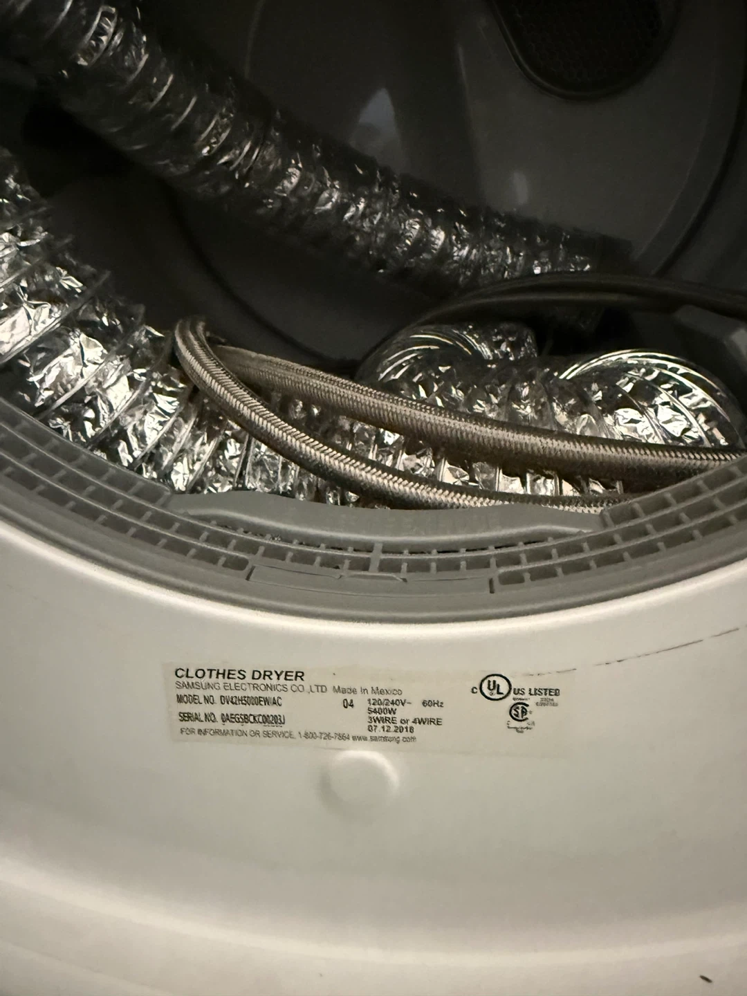 White Samsung clothes dryer with multiple settings like Heavy Duty, Normal, and Quick Dry, etc. Includes MoistureSensor technology for efficient drying. Works perfectly need to sell because we got a different set