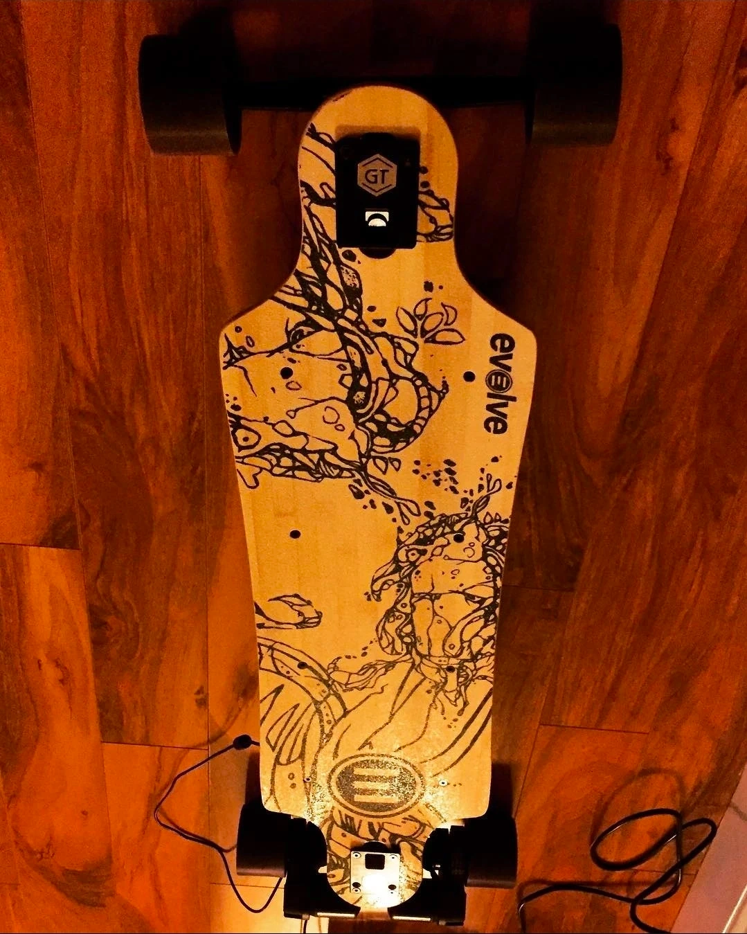 This is an Evolve GT Series electric skateboard. It features a unique graphic on the deck. The R2 remote is included with this board. and the original remote.