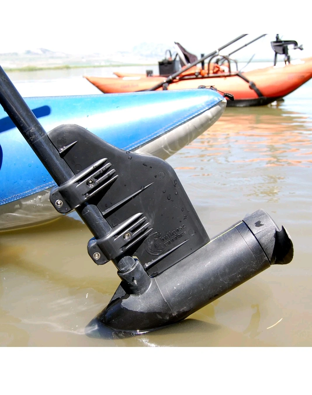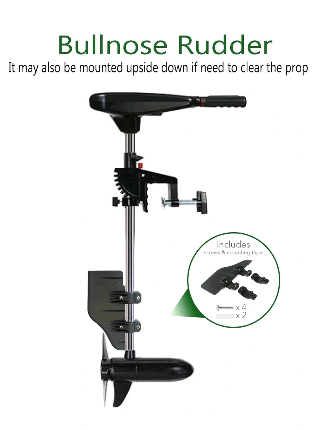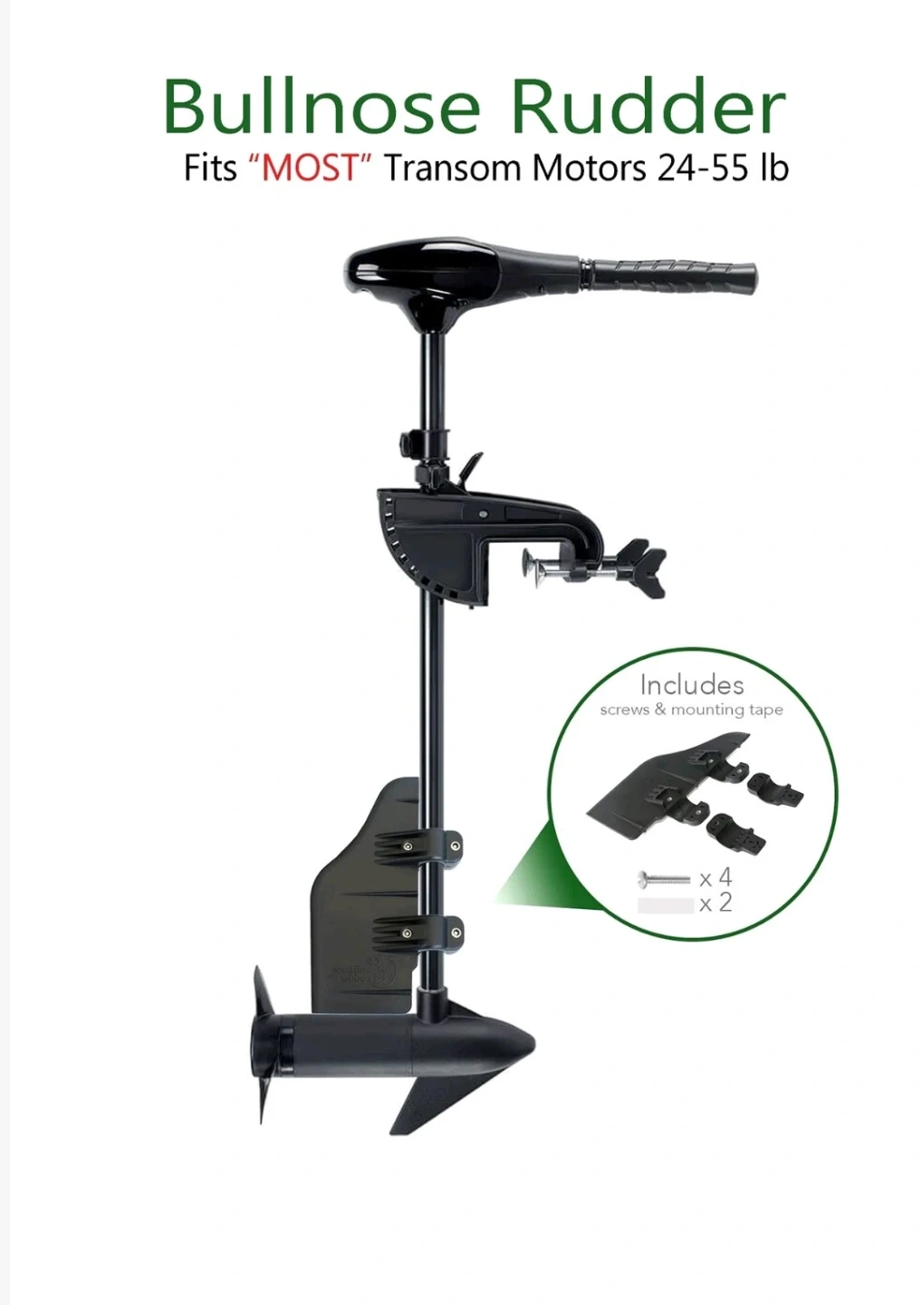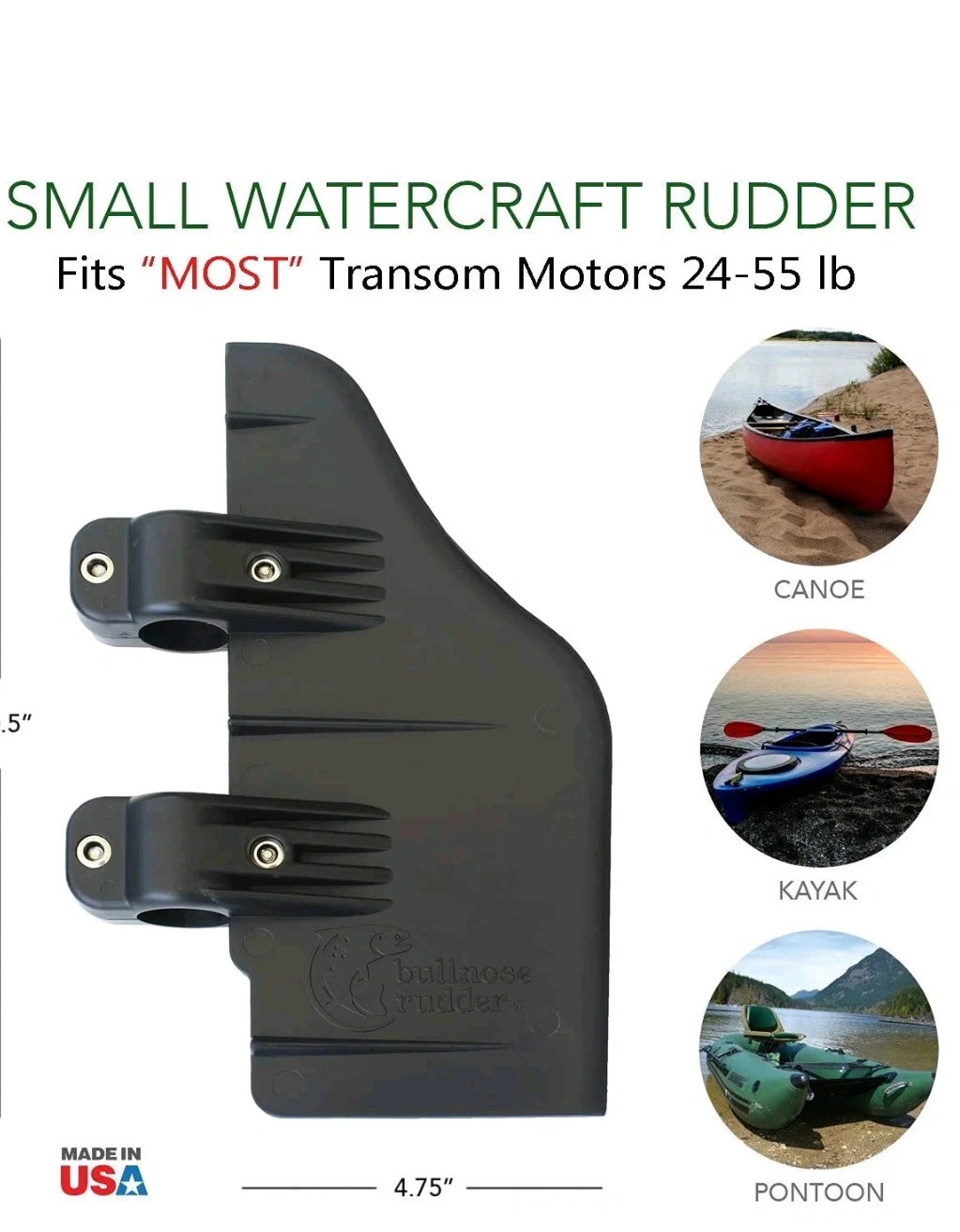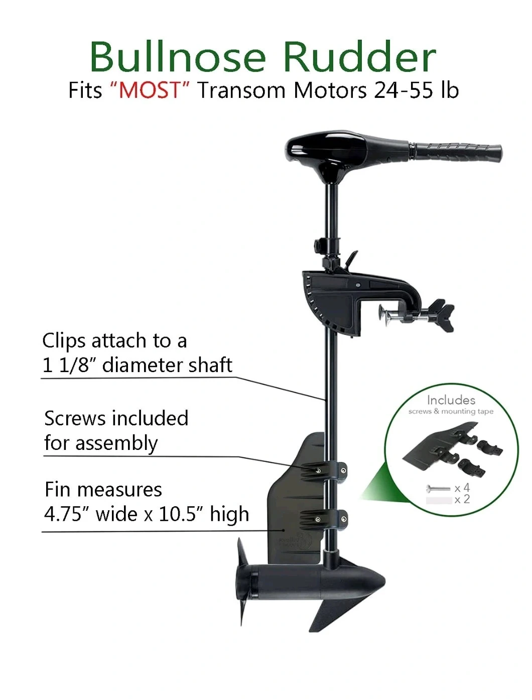 This Bullnose rudder fits most transom motors 24-55 lb. The fin measures 4.75" wide by 10.5" high. Clips attach to a 1 1/8" diameter shaft. Screws and mounting tape are included for assembly. It's made in the USA. This rudder helps improve steering on kayaks, canoes, and pontoons.
