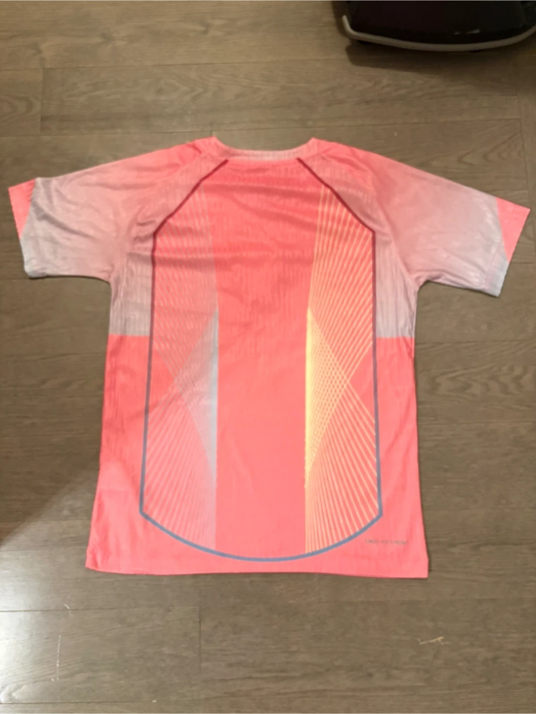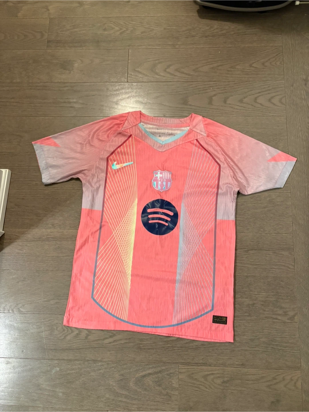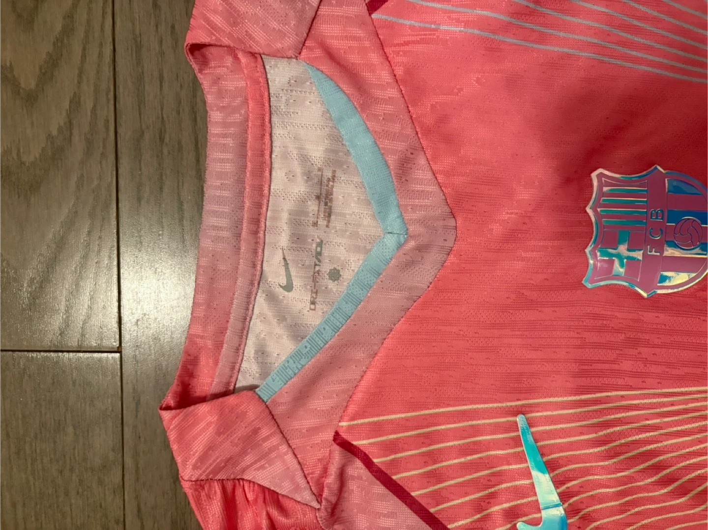 This is an FC Barcelona soccer jersey by Nike. It's a vibrant pink colour with a dynamic graphic design. The jersey features the FC Barcelona crest and sponsor logos.