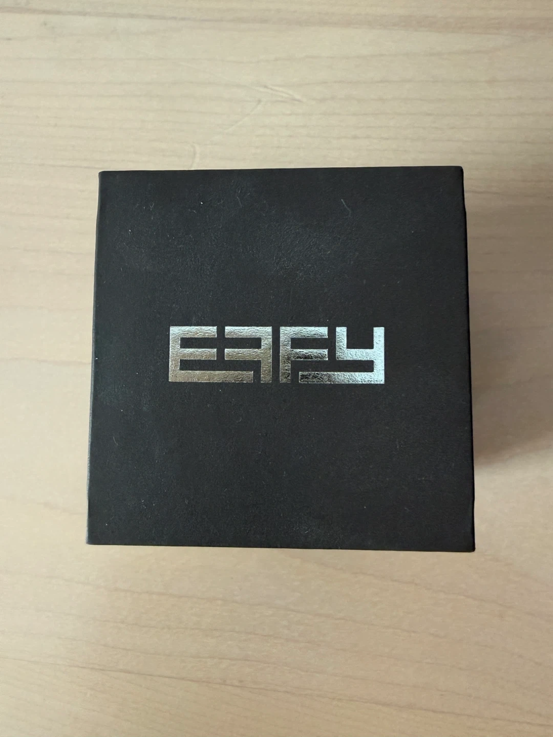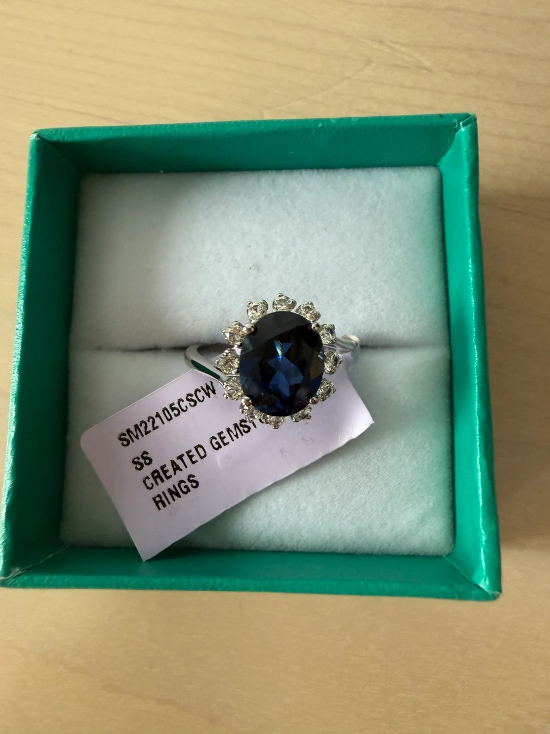 This EFY ring features a large, deep blue created gemstone surrounded by smaller clear stones. It's presented in a teal jewellery box, perfect for safekeeping. The original price was $200.00. The gemstones are created, and the band is silver-toned metal. Purchased from the BAY