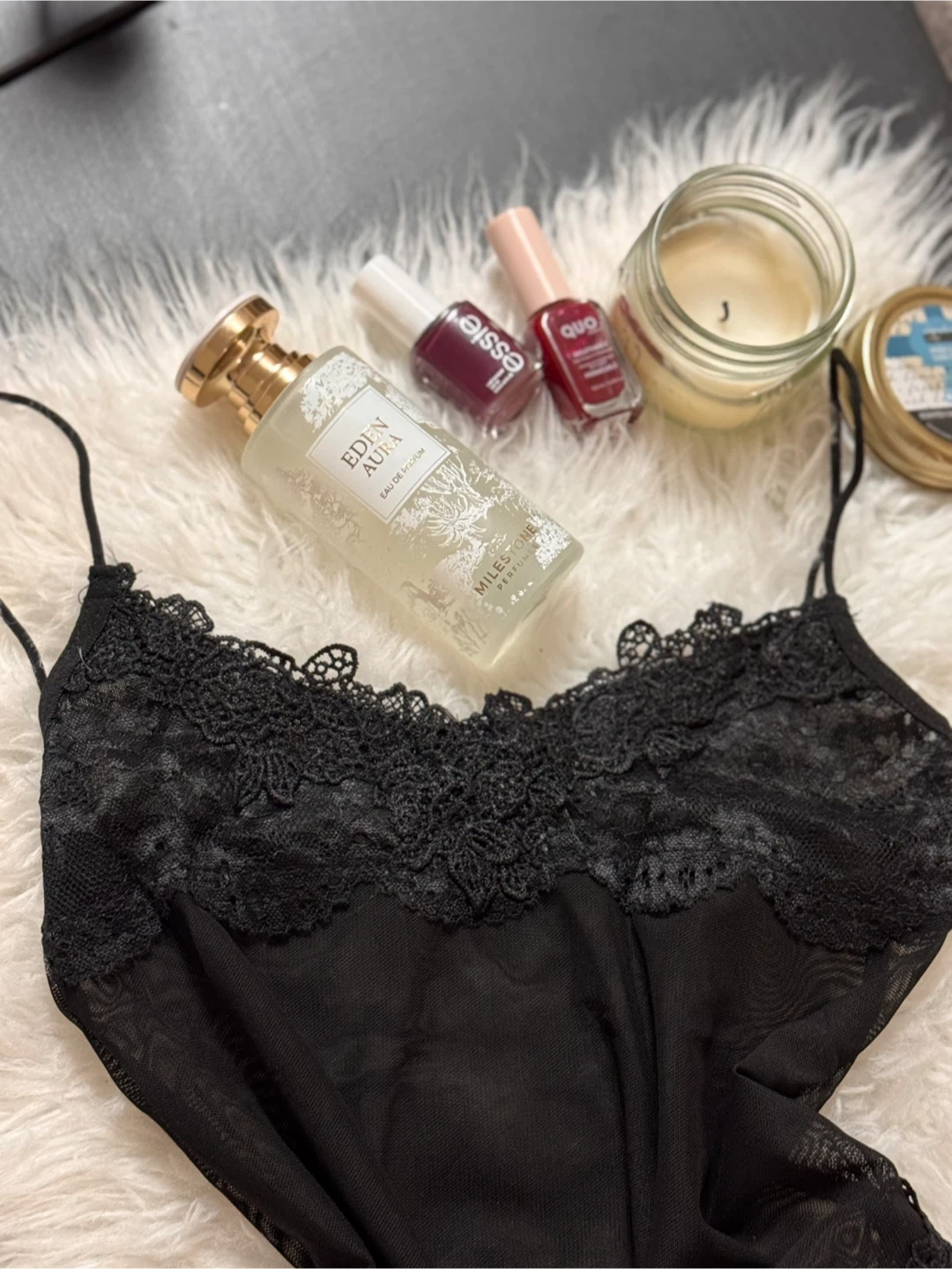 Sheer black lingerie with delicate lace trim. It features adjustable spaghetti straps for a comfortable fit. This piece is designed for a flattering silhouette.